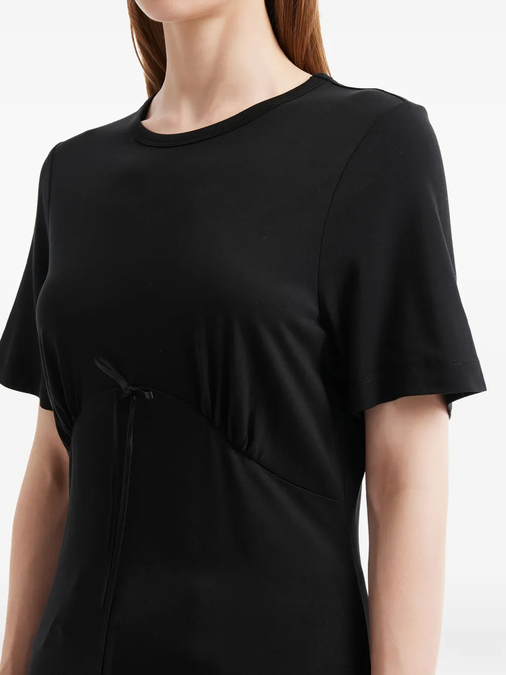 Черная футболка с круглым вырезом, короткими рукавами, присборенными деталями и отделкой лентой