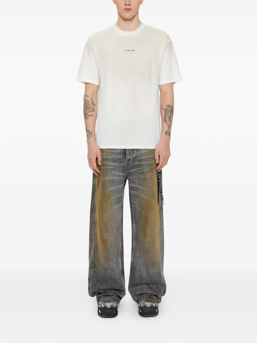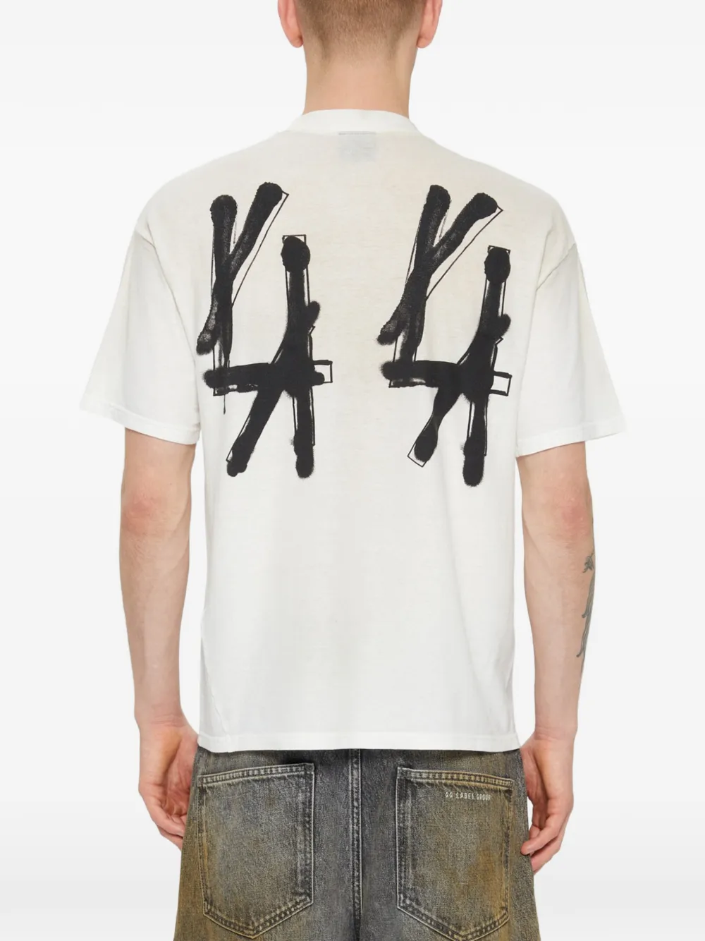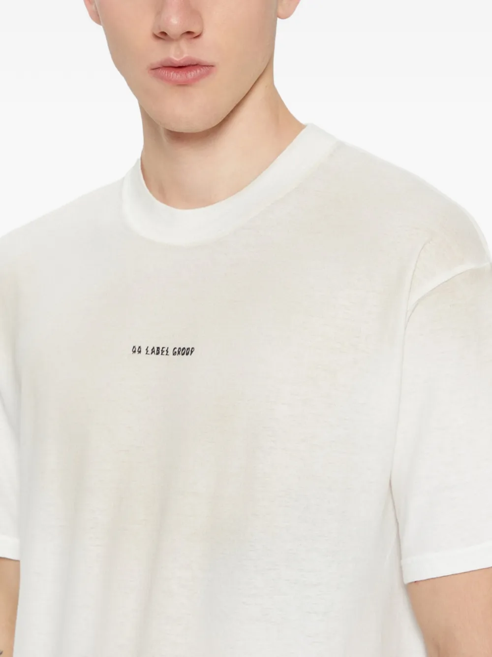 Белая футболка с принтом-логотипом, короткими рукавами, круглым вырезом и легкой отделкой