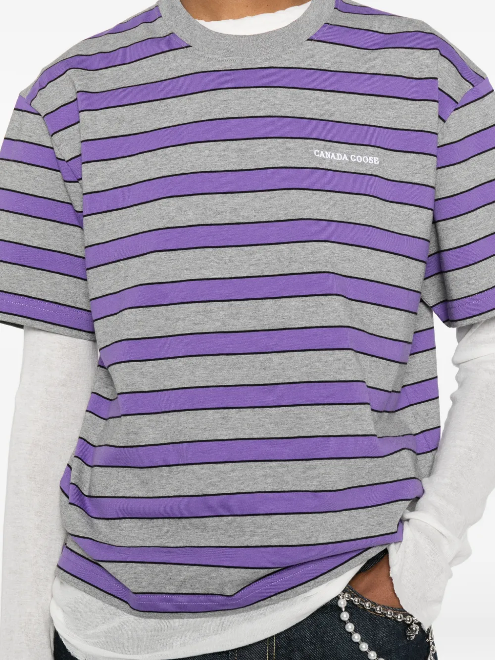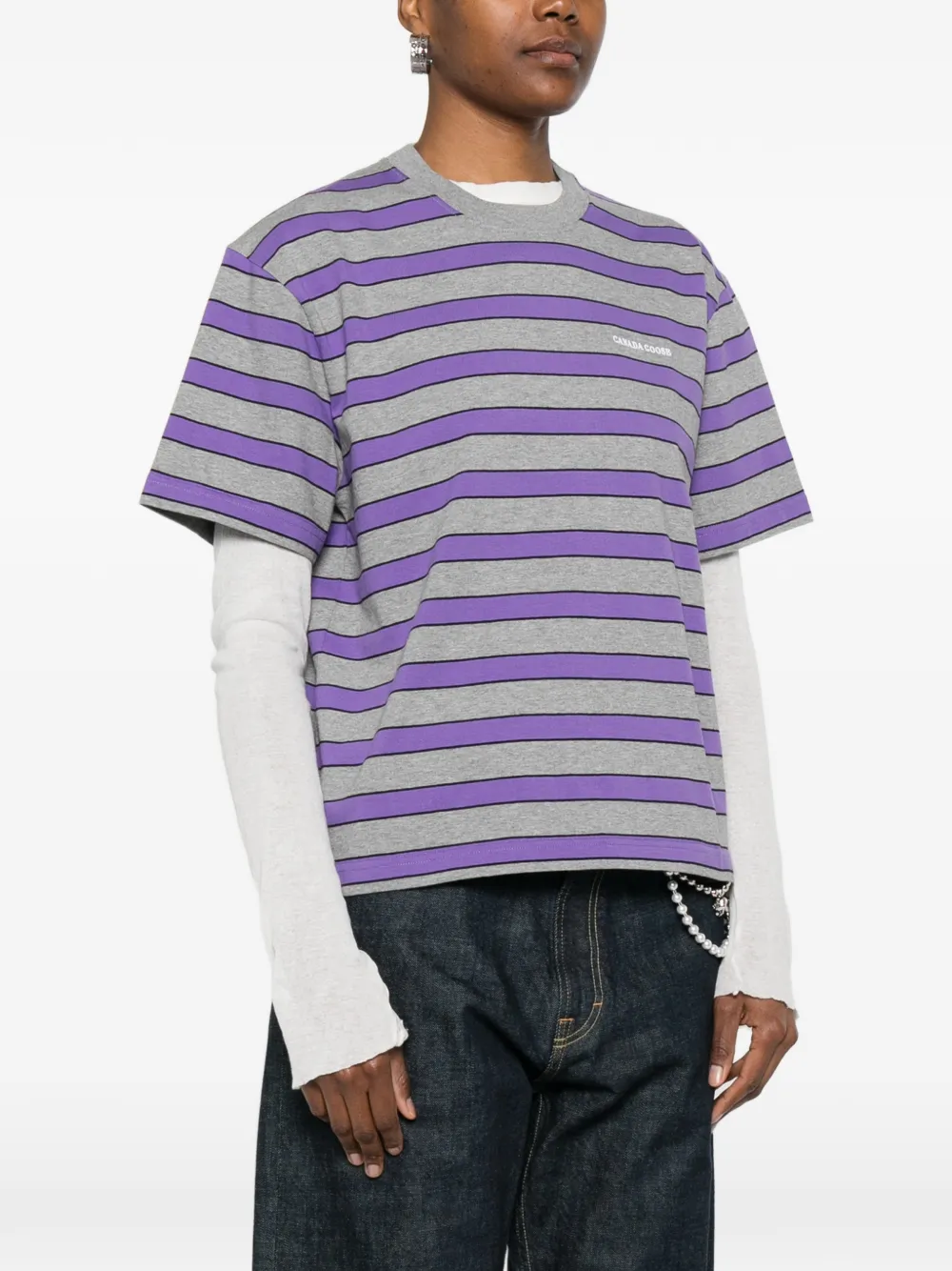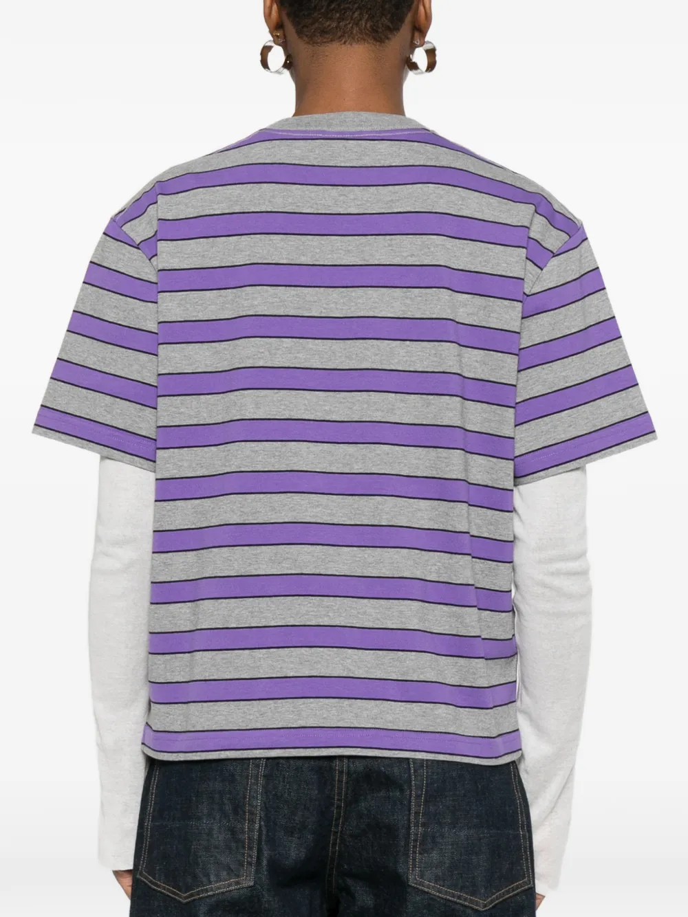 Сиренево-серая футболка в полоску с короткими рукавами, круглым вырезом и прямым низом
