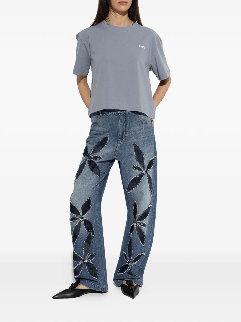 Синий свитшот с логотипом, круглым вырезом, короткими рукавами и прямым подолом
