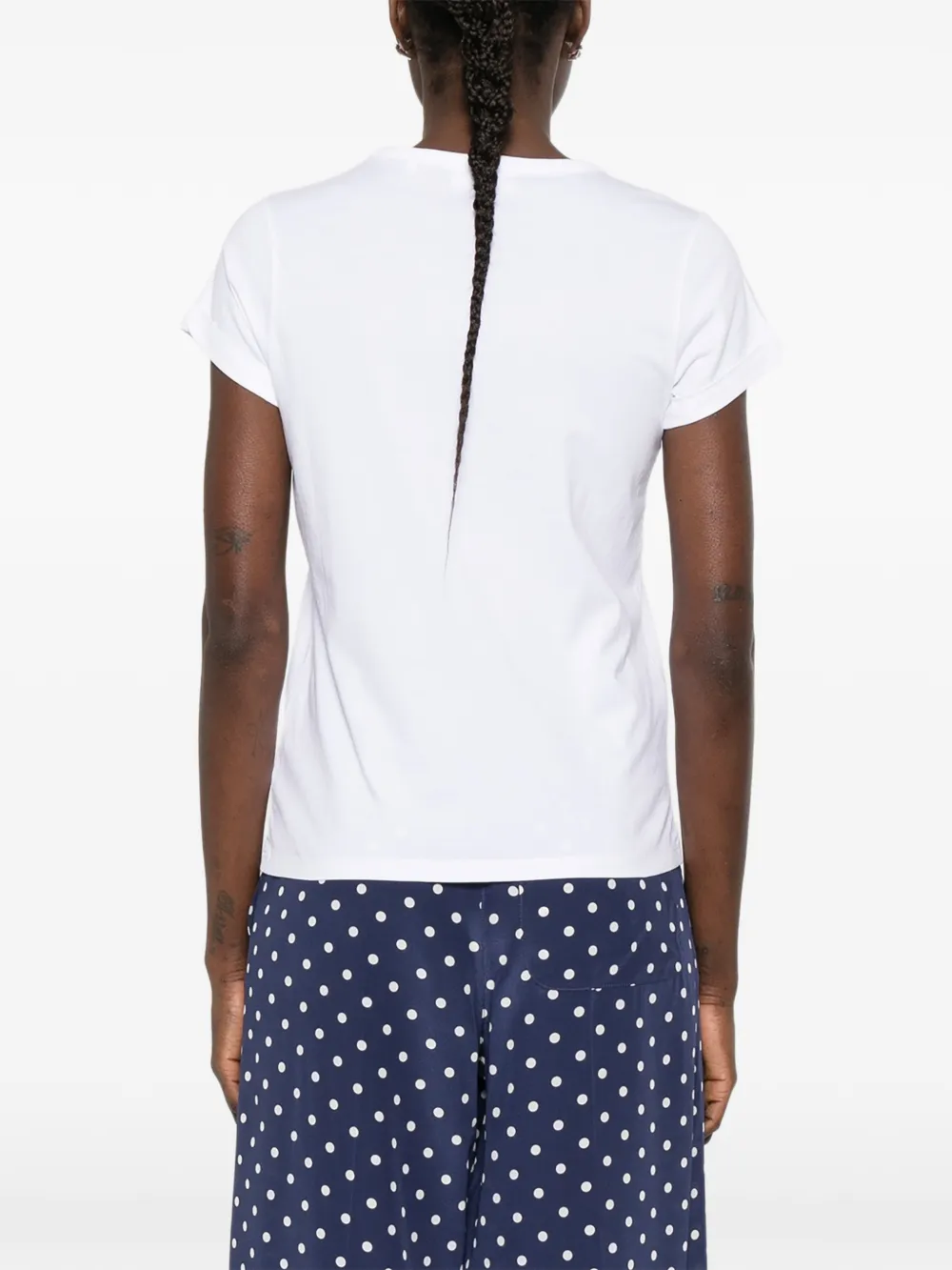 Белые буквы, круглый вырез, короткие рукава, подвернутые манжеты