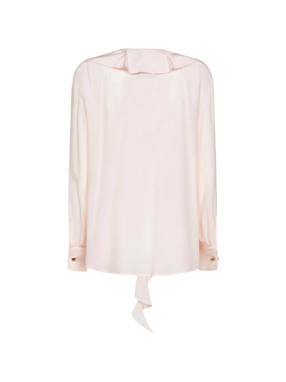 Светло-розовый круглый вырез, оборки на воротнике, манжеты с пуговицами, застежка спереди на видимых пуговицах, шелк