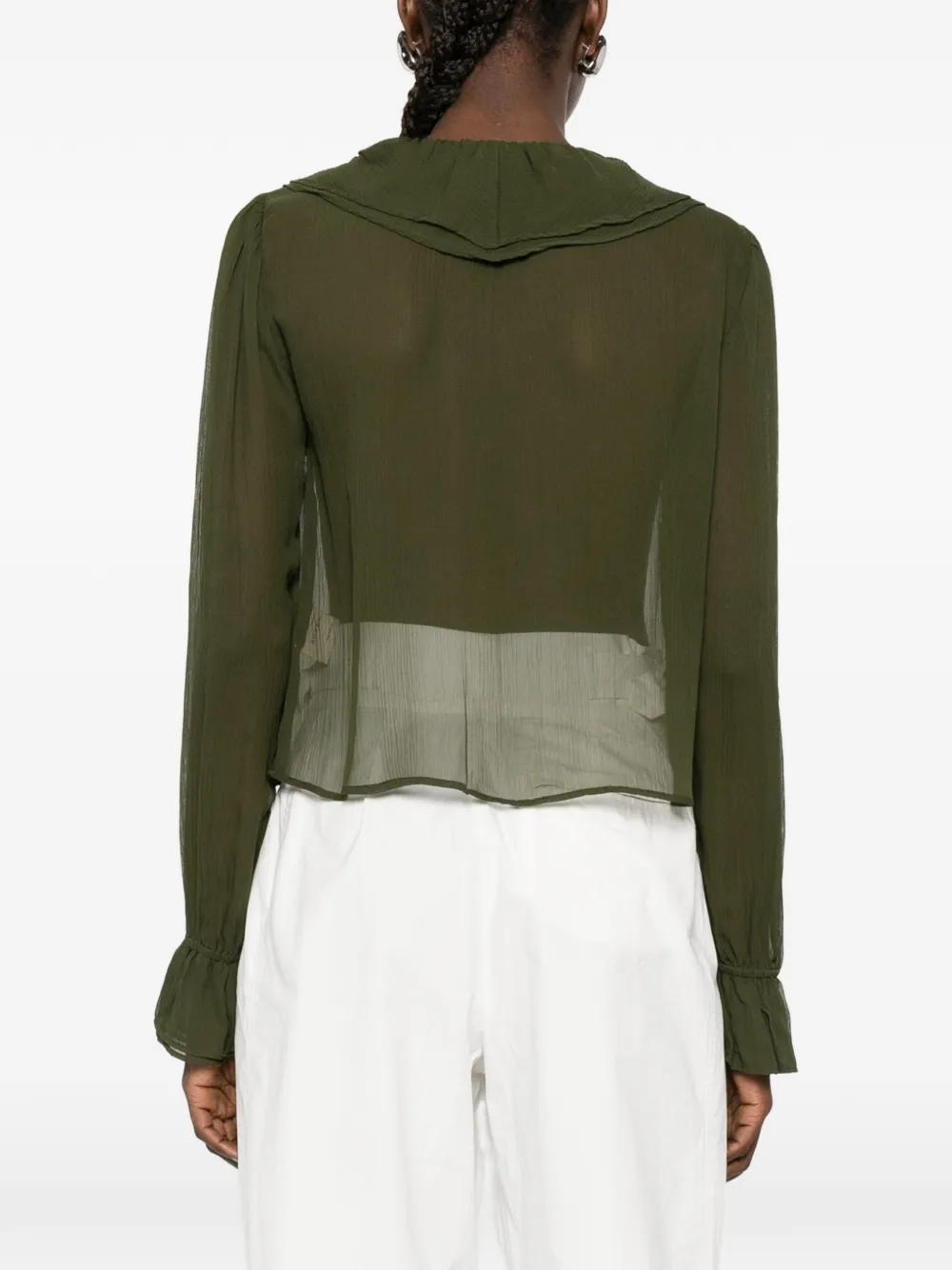 Зеленые оборки, воланы, длинные рукава, застежка на пуговицы, полупрозрачная