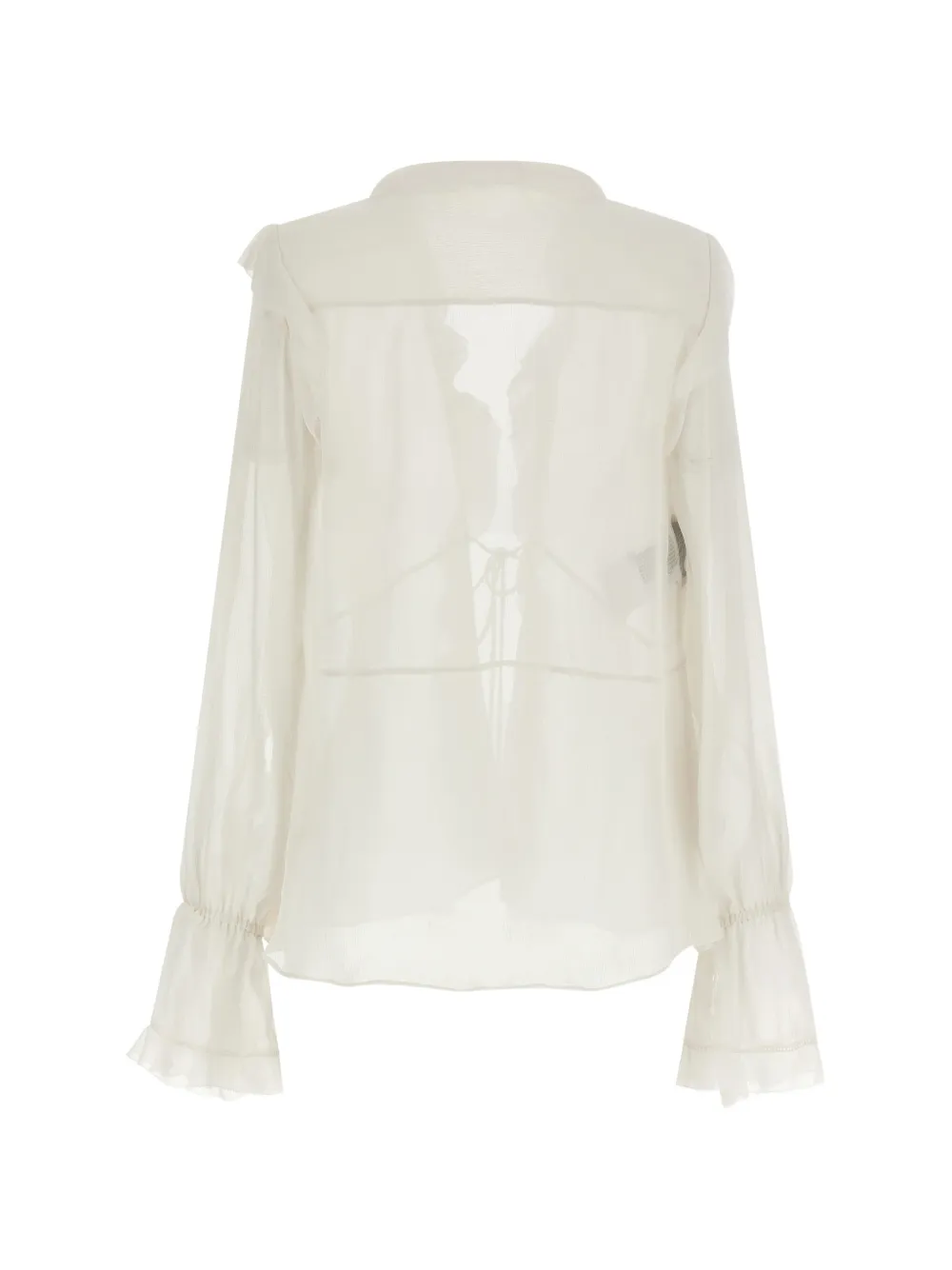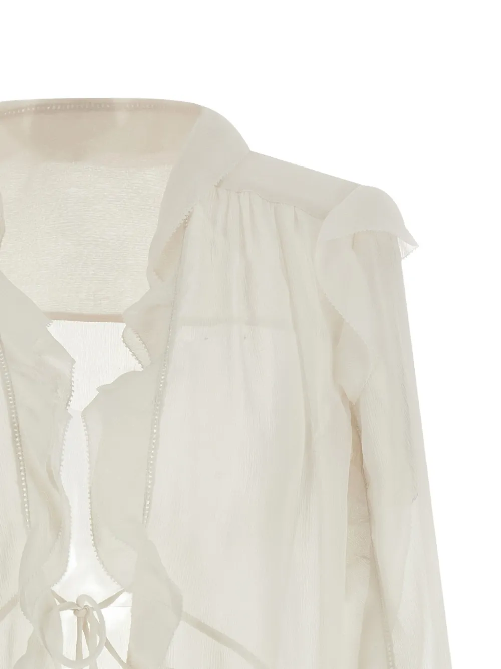 Бежевый цвет, детали с оборками, застежка на завязках, полупрозрачный
