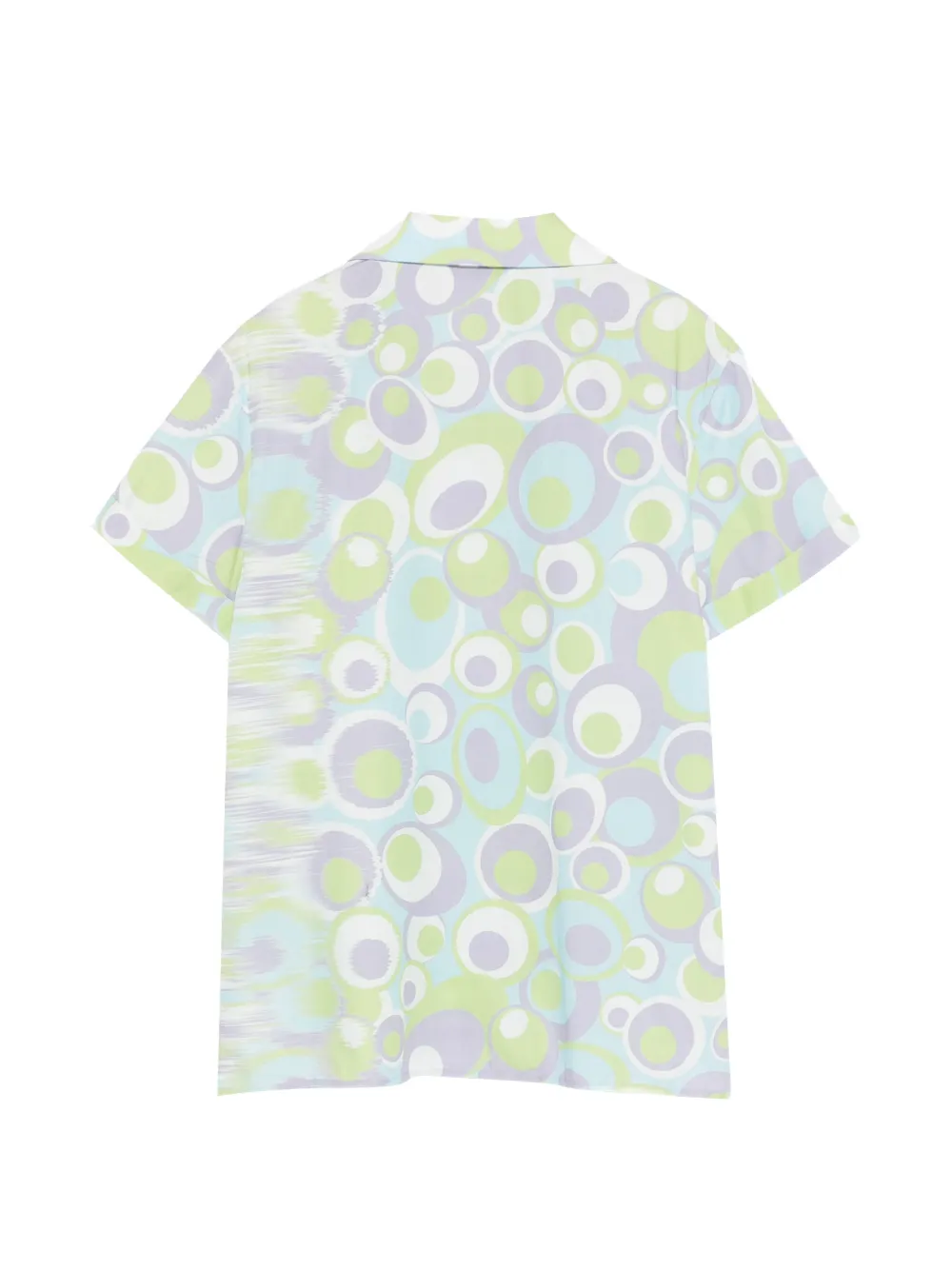 Сиреневый и разноцветный, застежка на пуговицы, короткие рукава, круглый узор, лацканы с вырезом, принт по всей поверхности