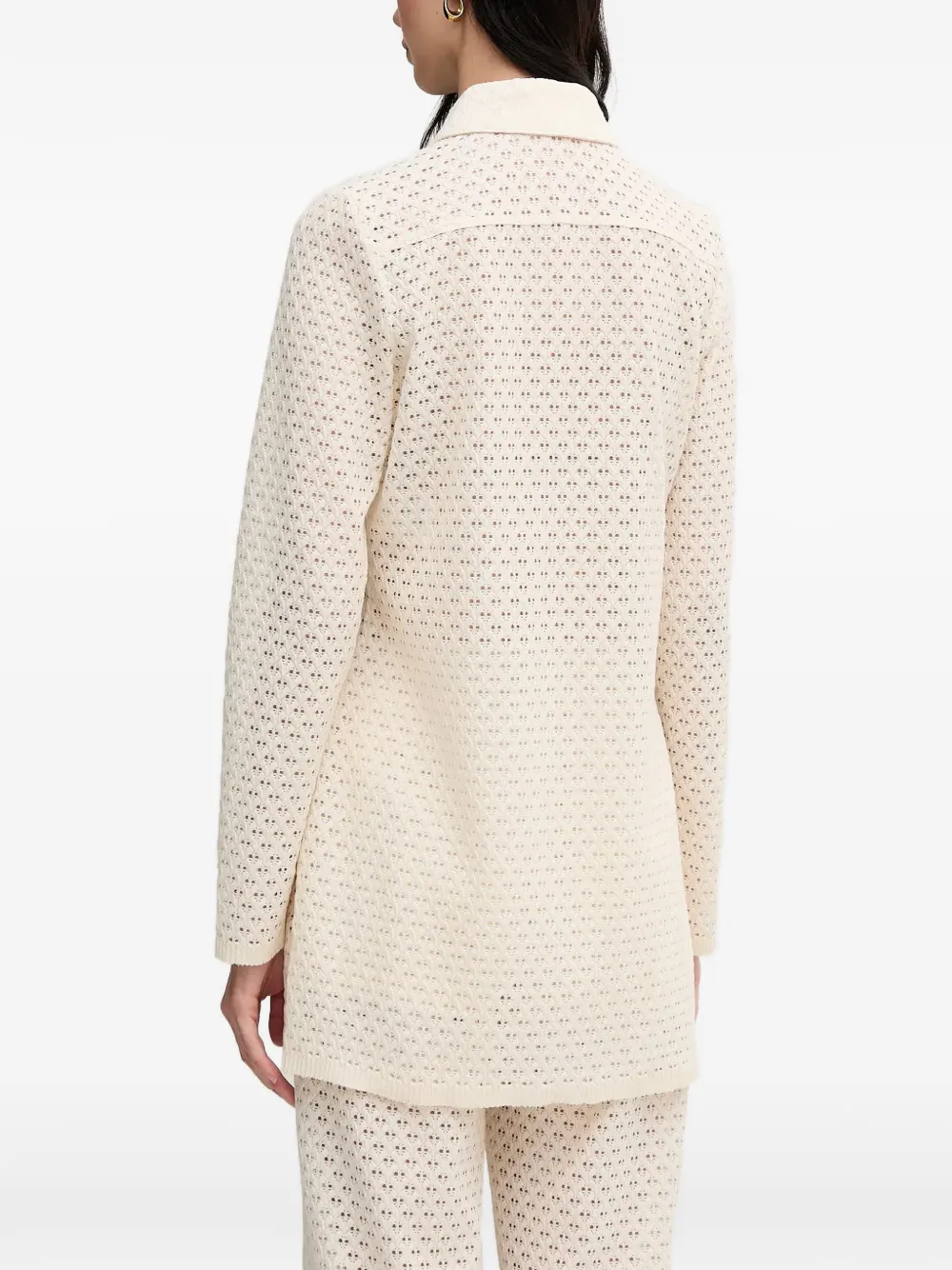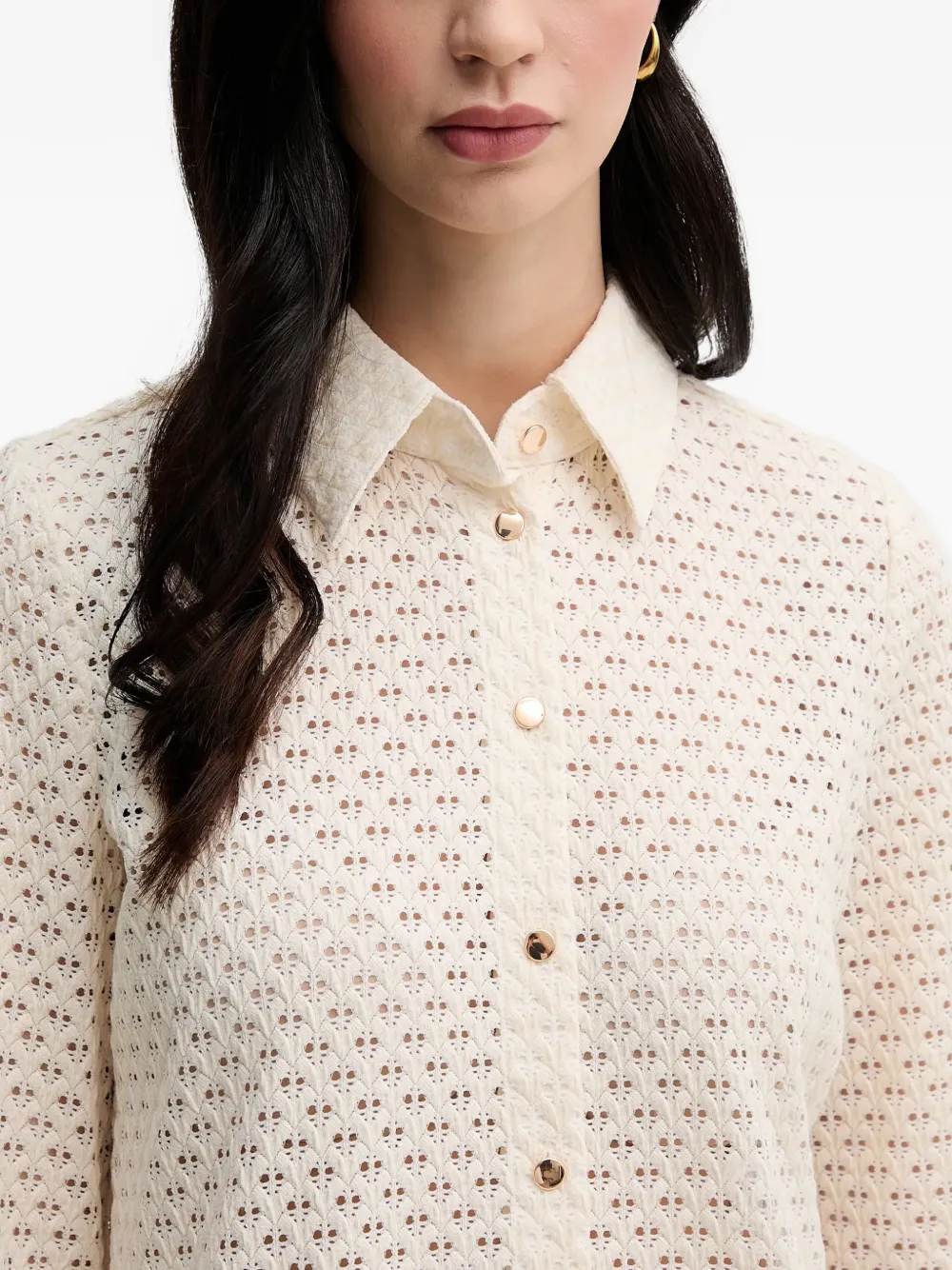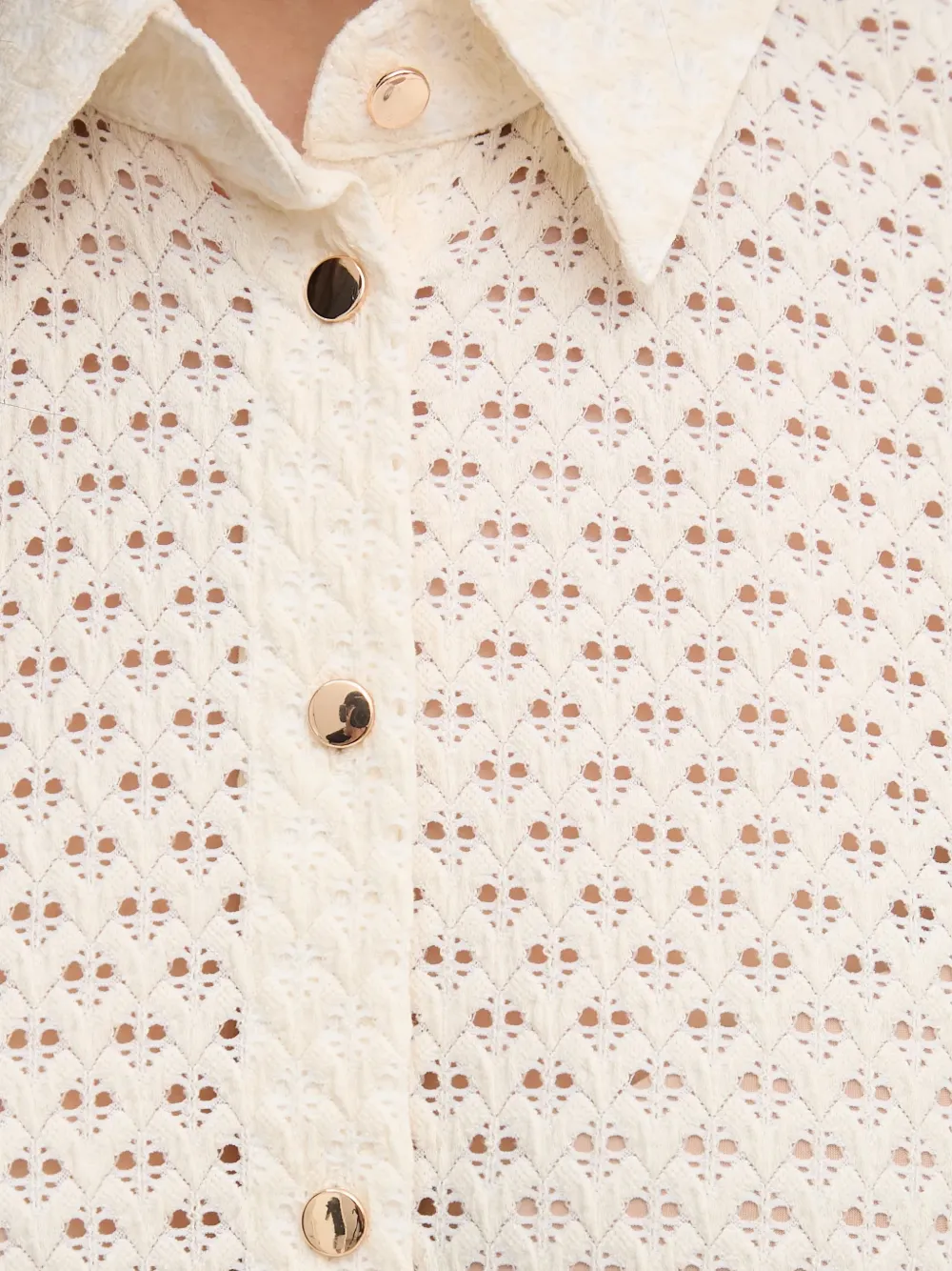 Бежевый, перфорированный дизайн, застежка на пуговицы, отложной воротник, длинные рукава, прямой подол