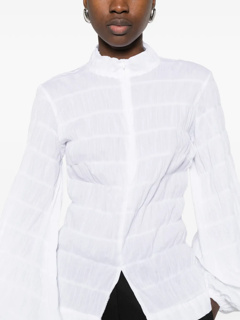 Белый топ с застежкой-молнией спереди, рукавами «баллон», высоким воротником и эластичным подолом