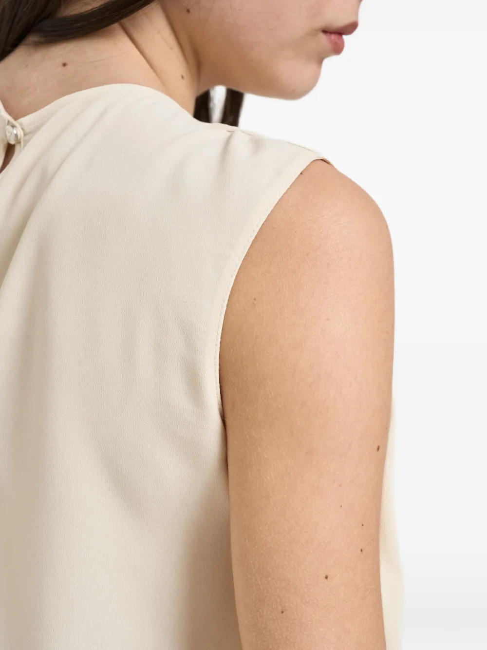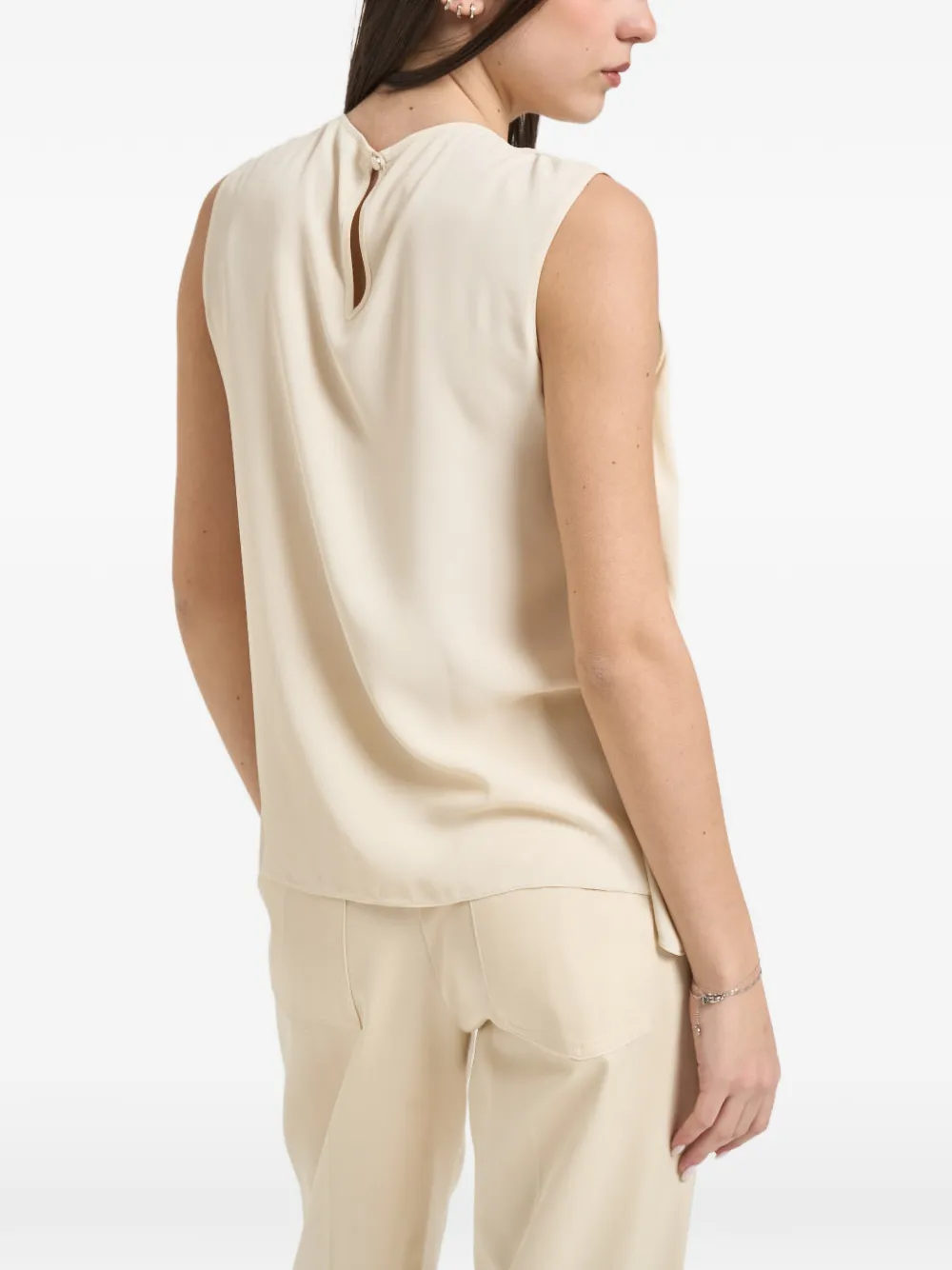 Бежевый топ без рукавов с круглым вырезом, застежкой на пуговицу и разрезом-капелькой на спине