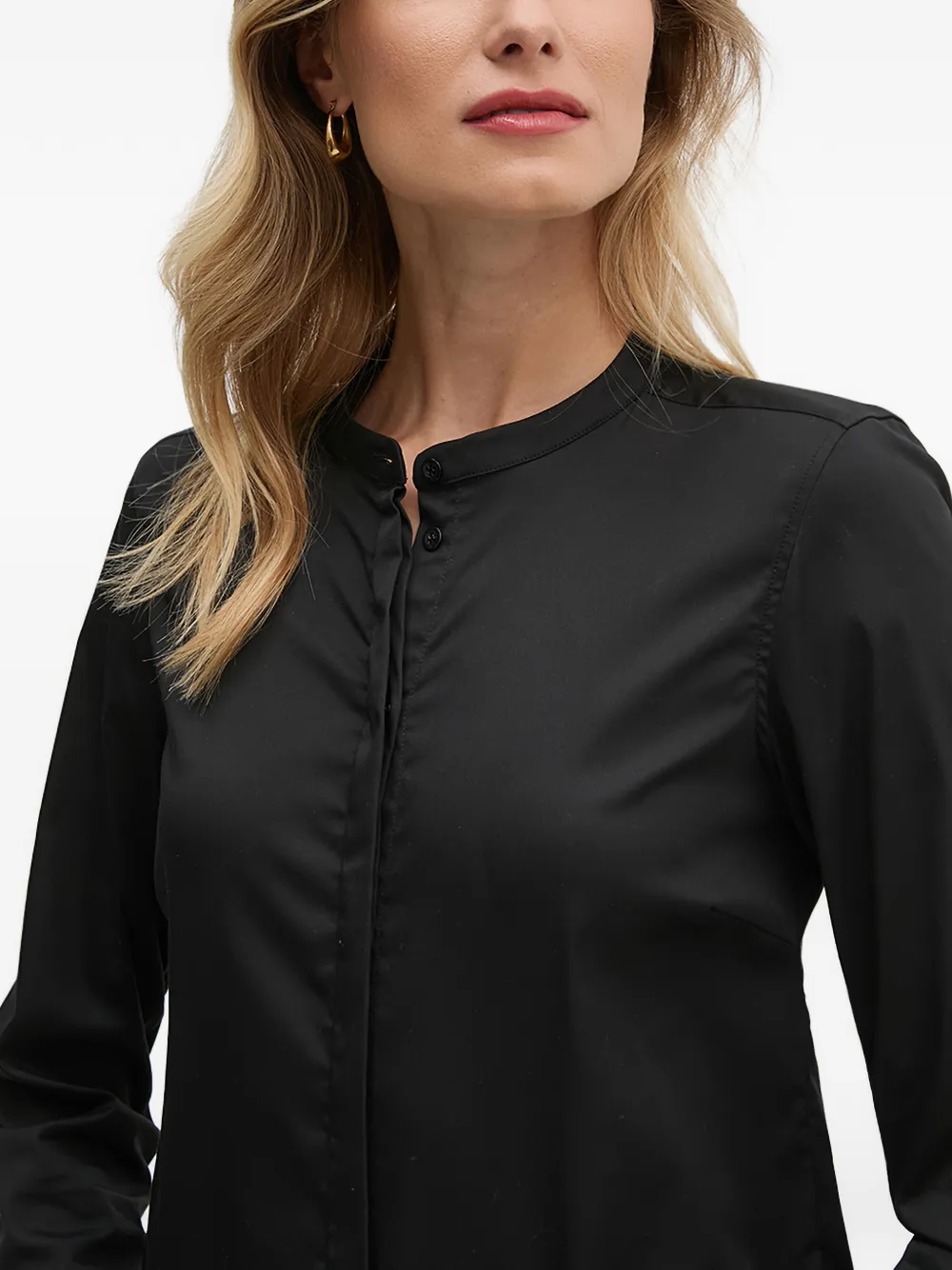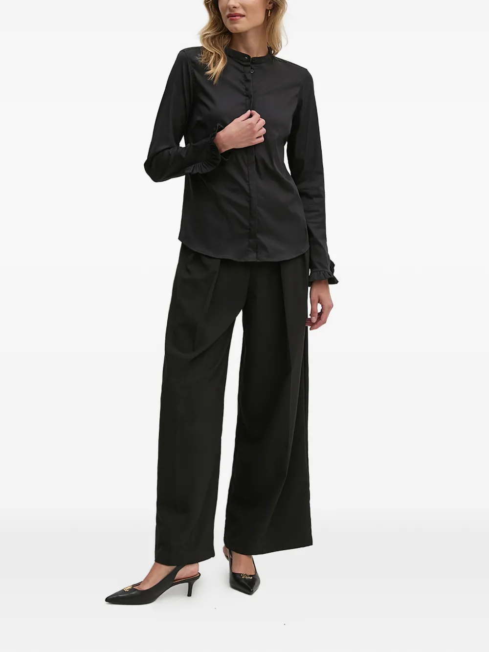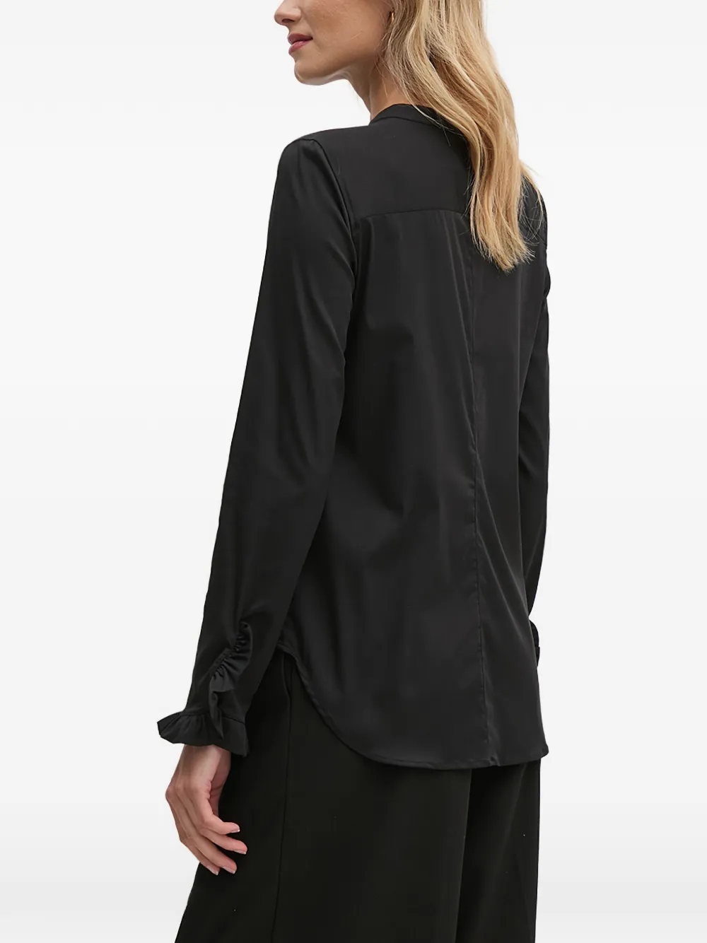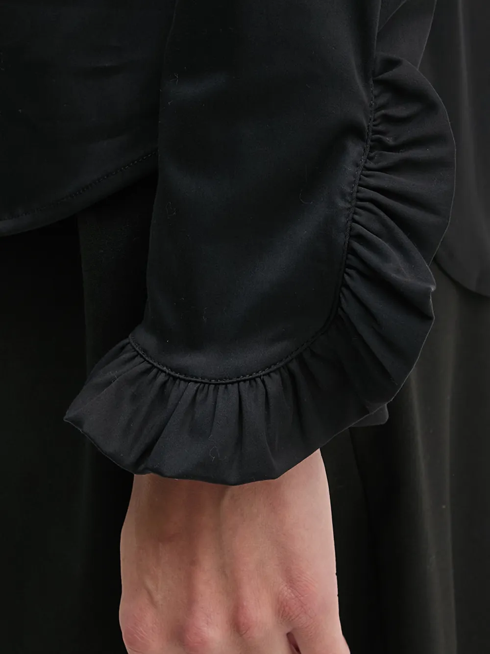 Черный цвет, оборчатые манжеты, застежка на пуговицы, длинные рукава, закругленный подол
