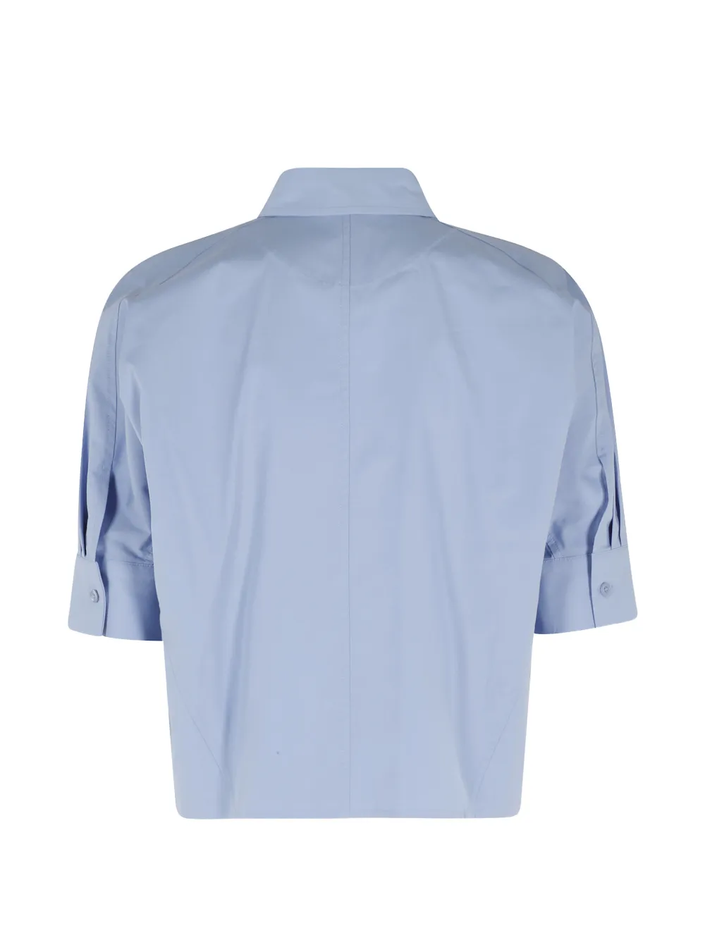 Синие манжеты на пуговицах, заостренный воротник, короткие рукава, застежка на пуговицы