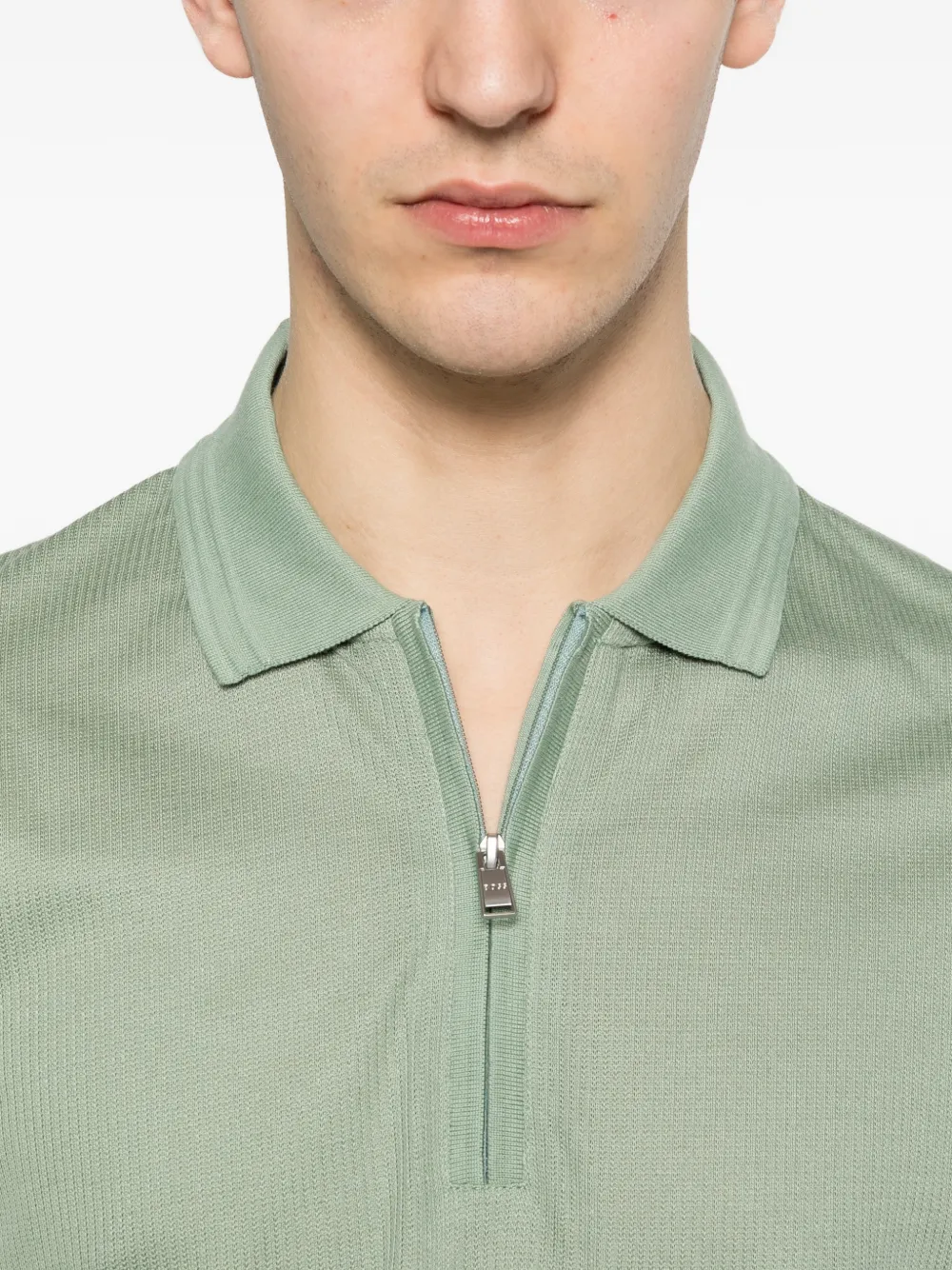 Светло-зеленый, фактурная отделка, короткие рукава, застежка-молния, воротник поло, стандартный крой