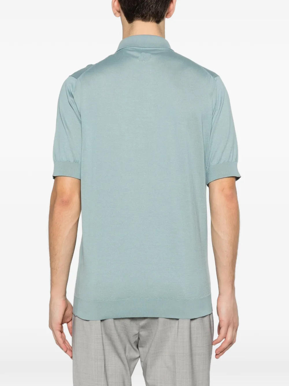 Синий поло с воротником, застежкой на пуговицы, короткими рукавами, ребристым подолом и манжетами