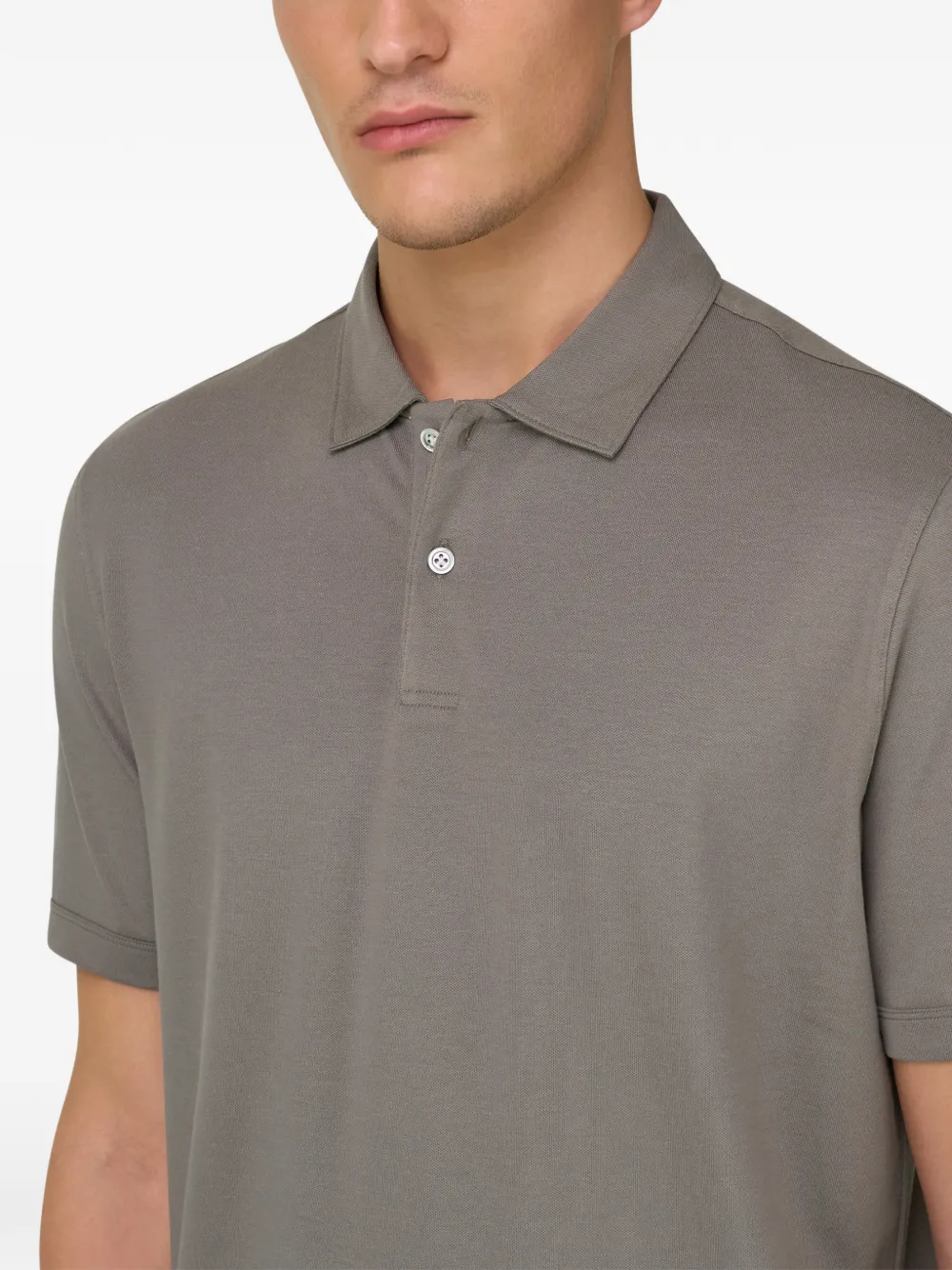 Серое поло с аппликацией, плетением пике, короткими рукавами, воротником и застежкой на пуговицы