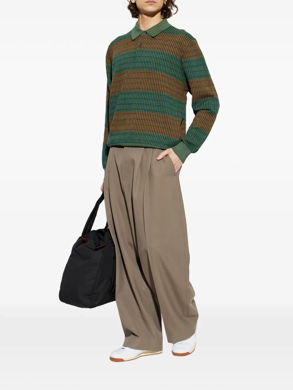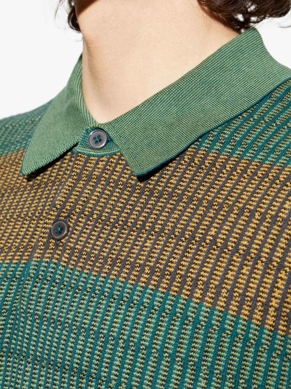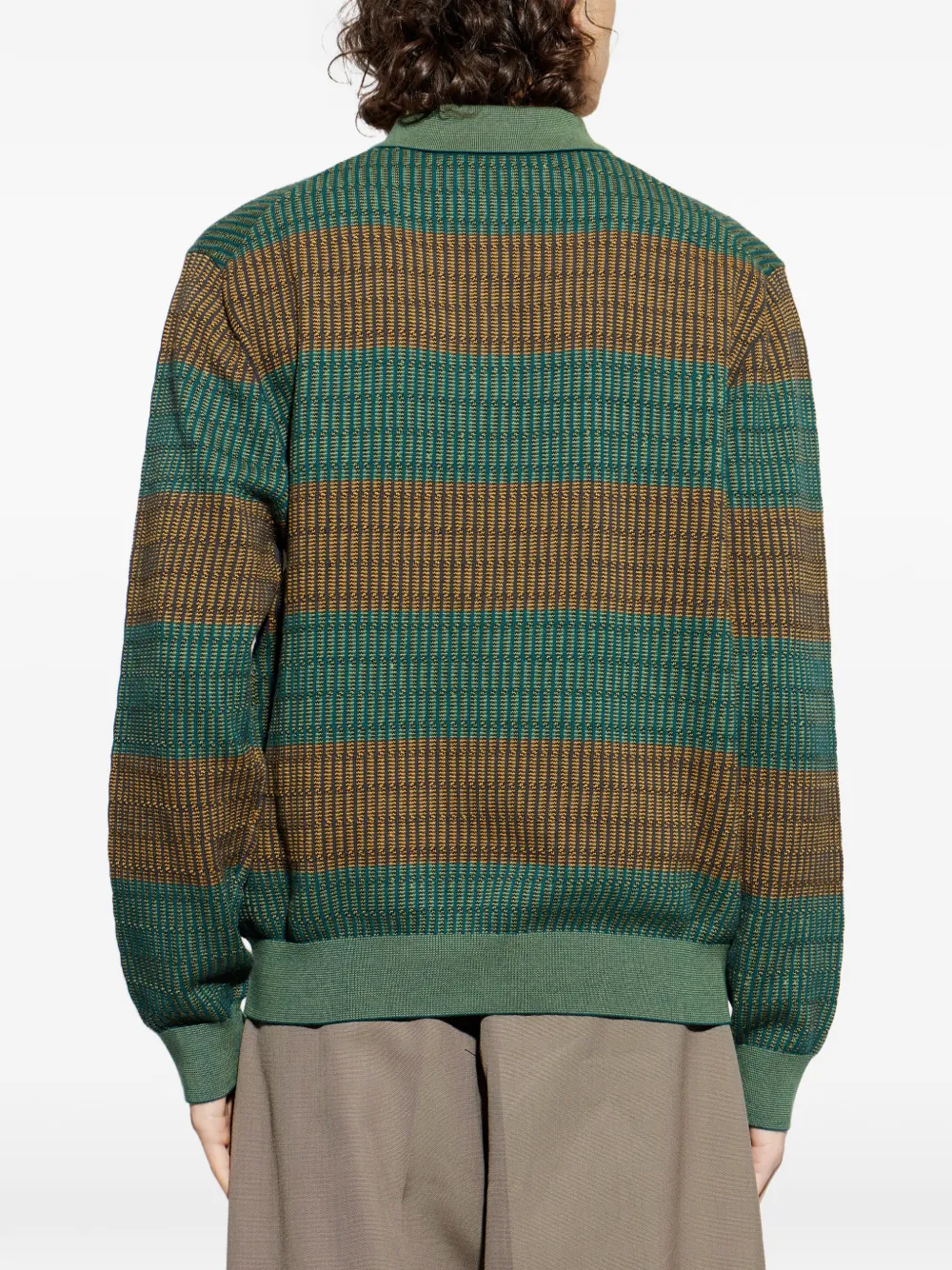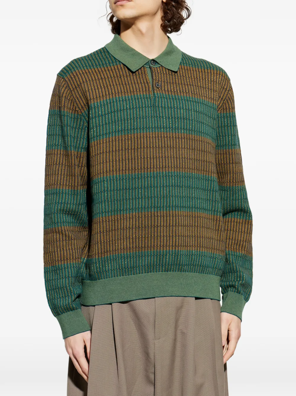 Зеленый полосатый джемпер на пуговицах с поло-воротником, ребристым низом и длинными рукавами