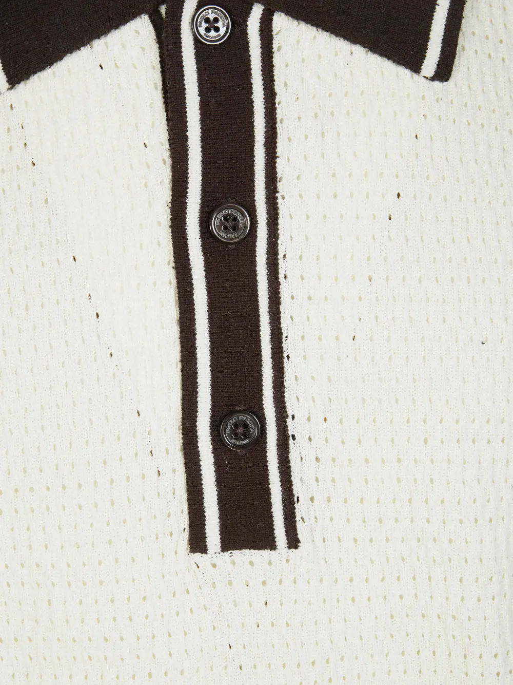 Белая вязаная футболка с застежкой на полпуговицы, полосатым воротником и короткими рукавами