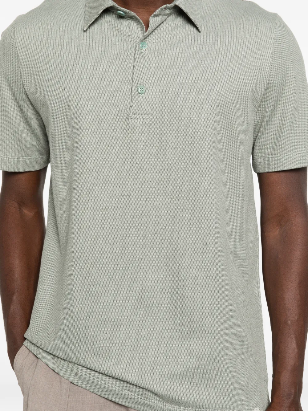 Светло-зеленое поло с застежкой на пуговицы, короткими рукавами, воротником и прямым подолом