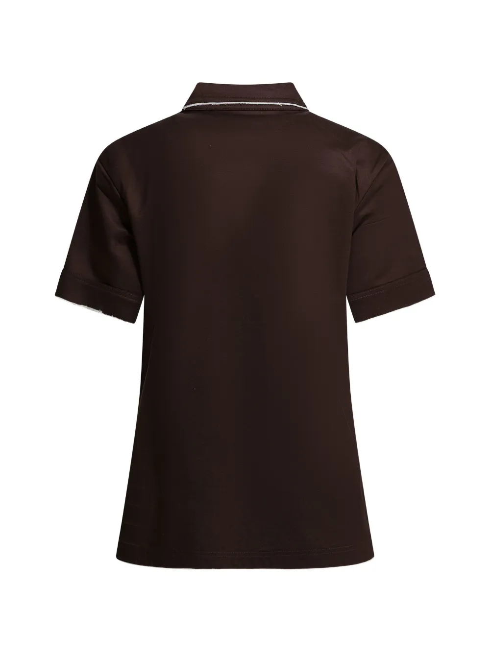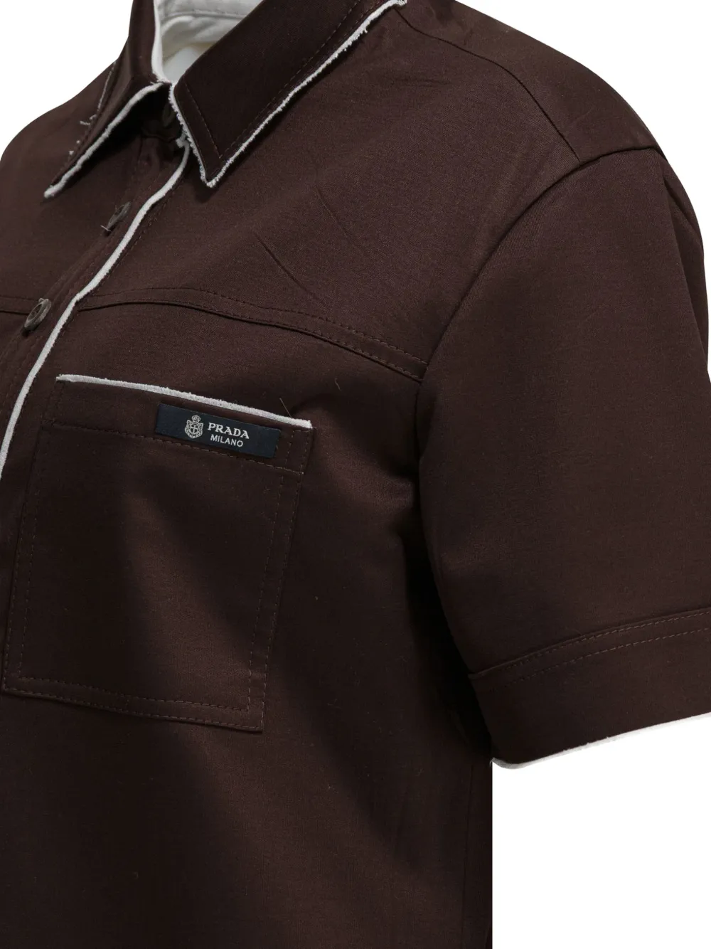Коричневая рубашка с окантовкой, нагрудным карманом, застежкой на пуговицы, короткими рукавами и отложным воротником