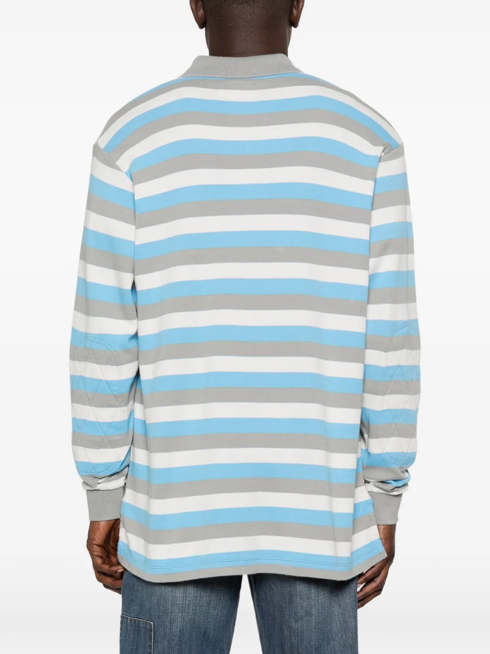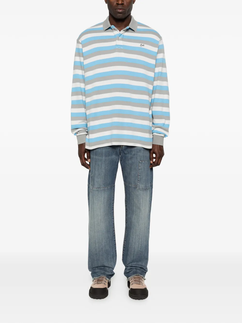 Голубая полосатая хлопковая рубашка/джемпер с воротником-поло, длинными рукавами, боковыми разрезами и вышивкой