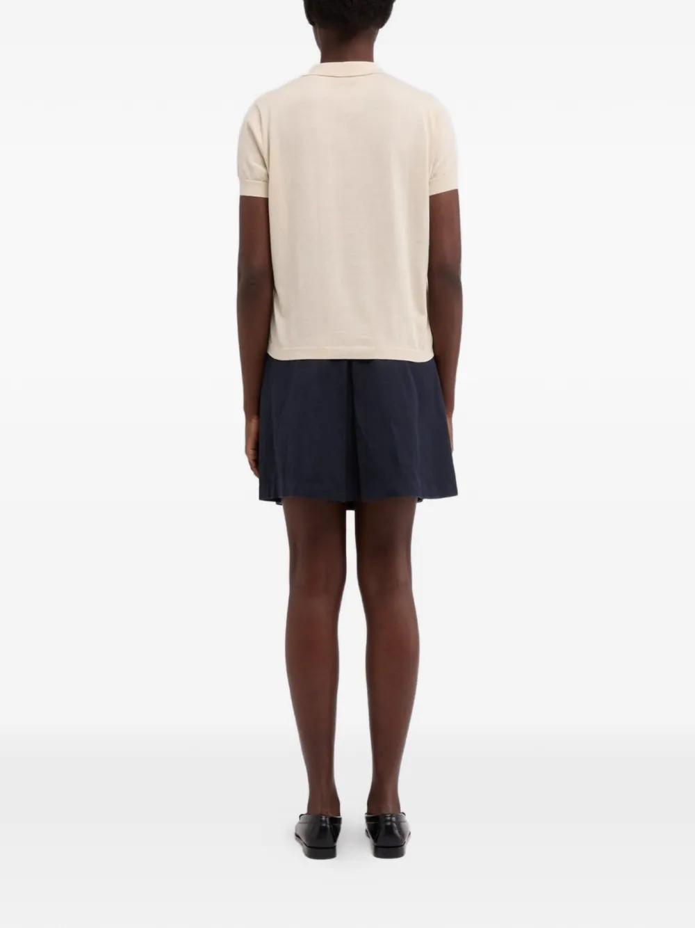 Бежевый с ребристой отделкой, застежка на пуговицы, короткие рукава, воротник поло