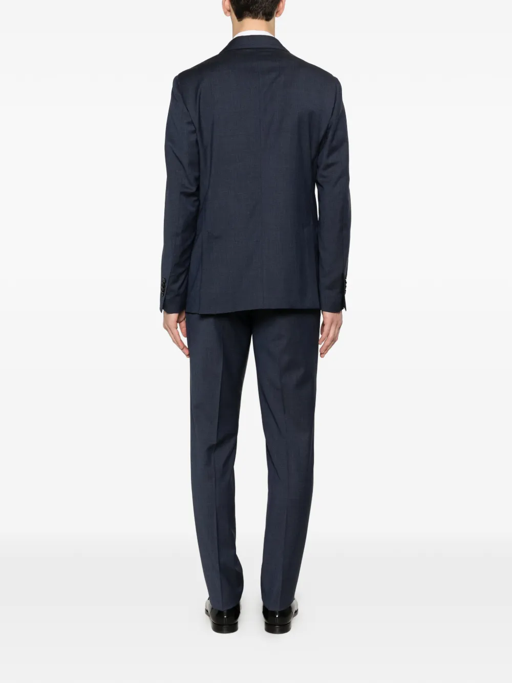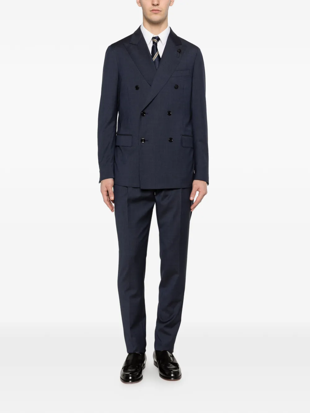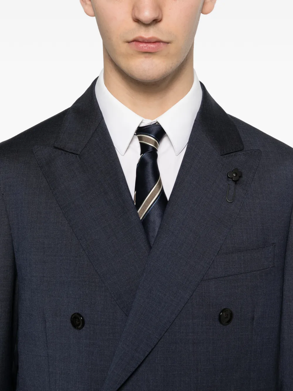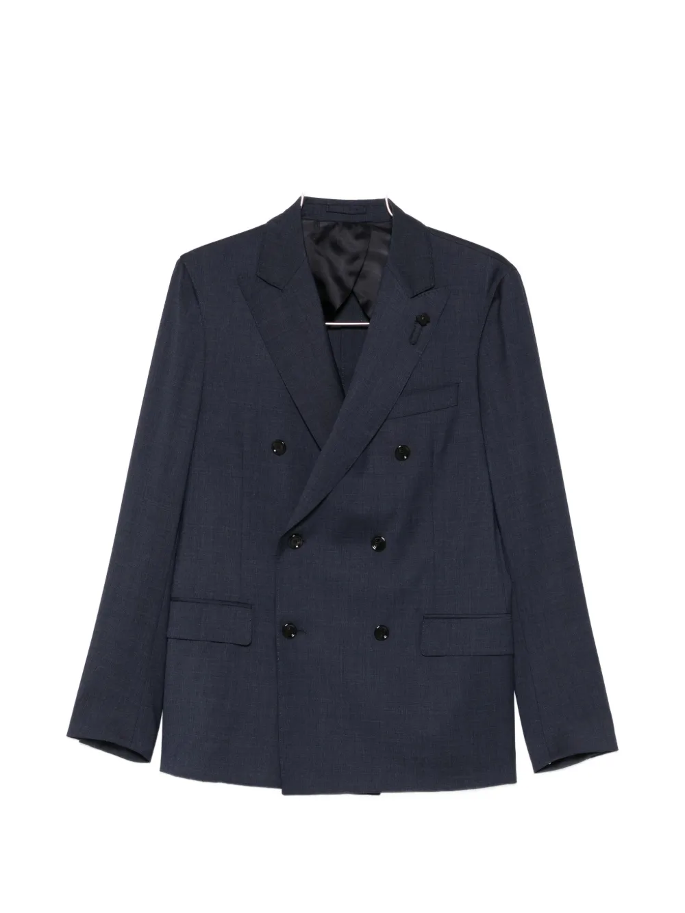 Темно-синий двубортный пиджак на пуговицах с лацканами с вырезом и прорезными карманами с клапанами