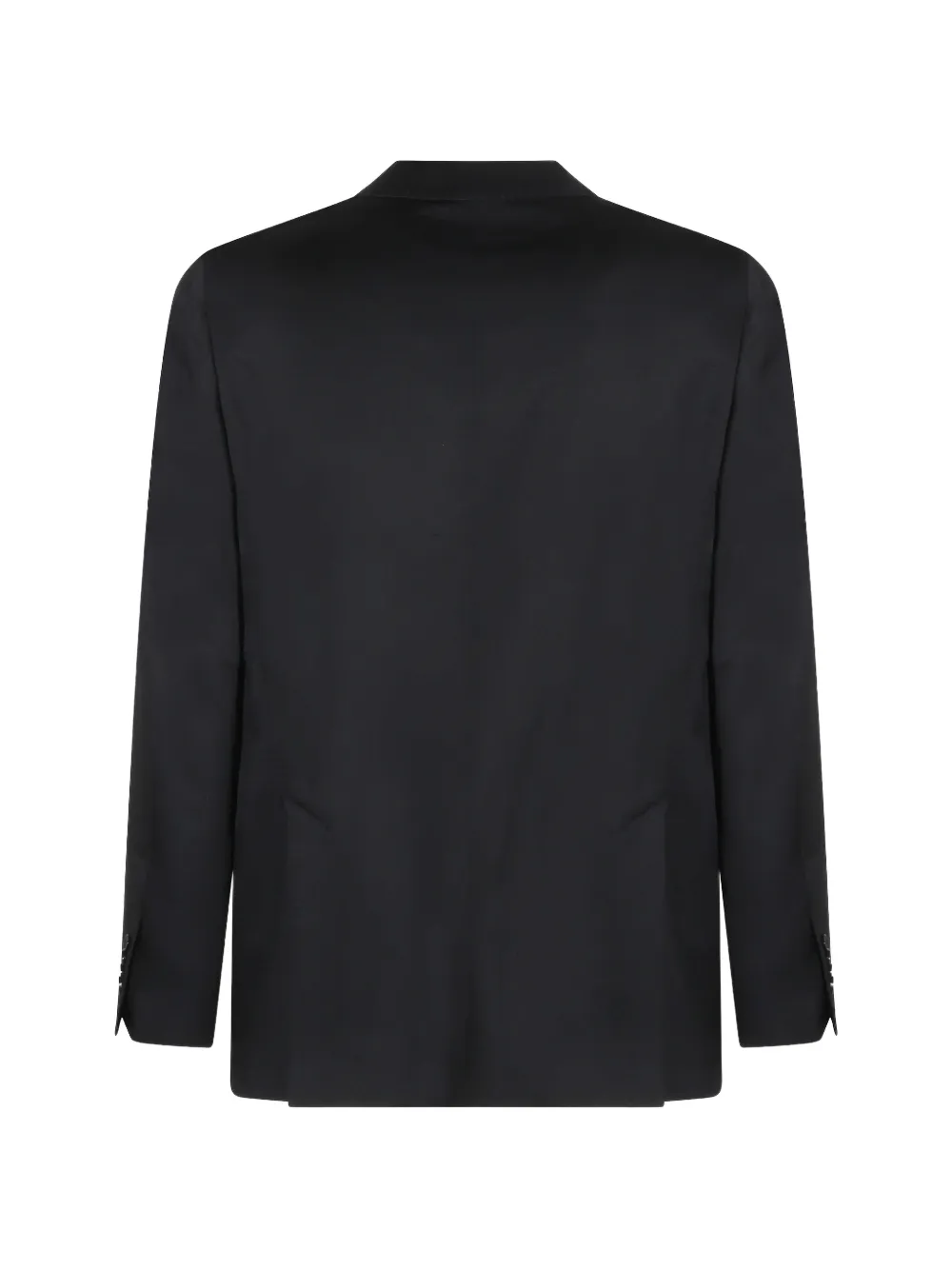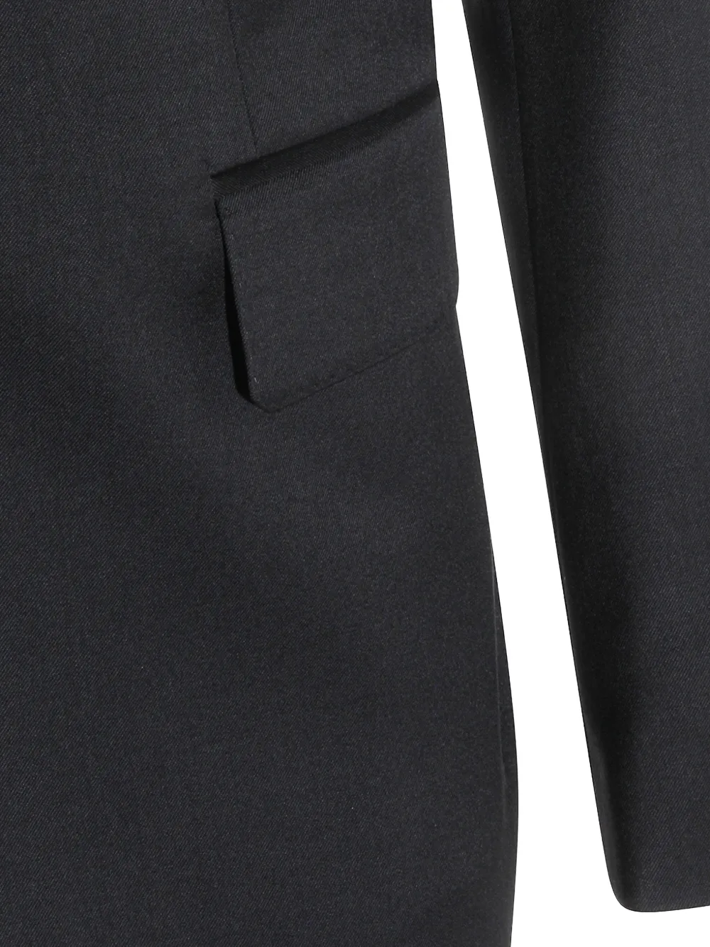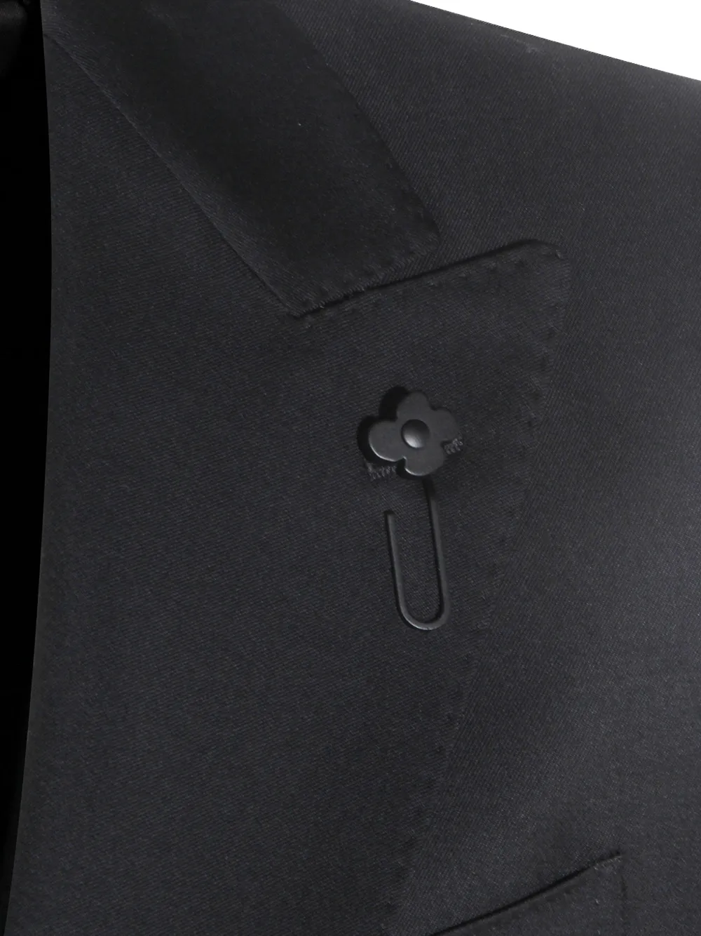 Черные лацканы шалькой, застежка на пуговицы, булавка в виде цветка, прорезные карманы с клапанами