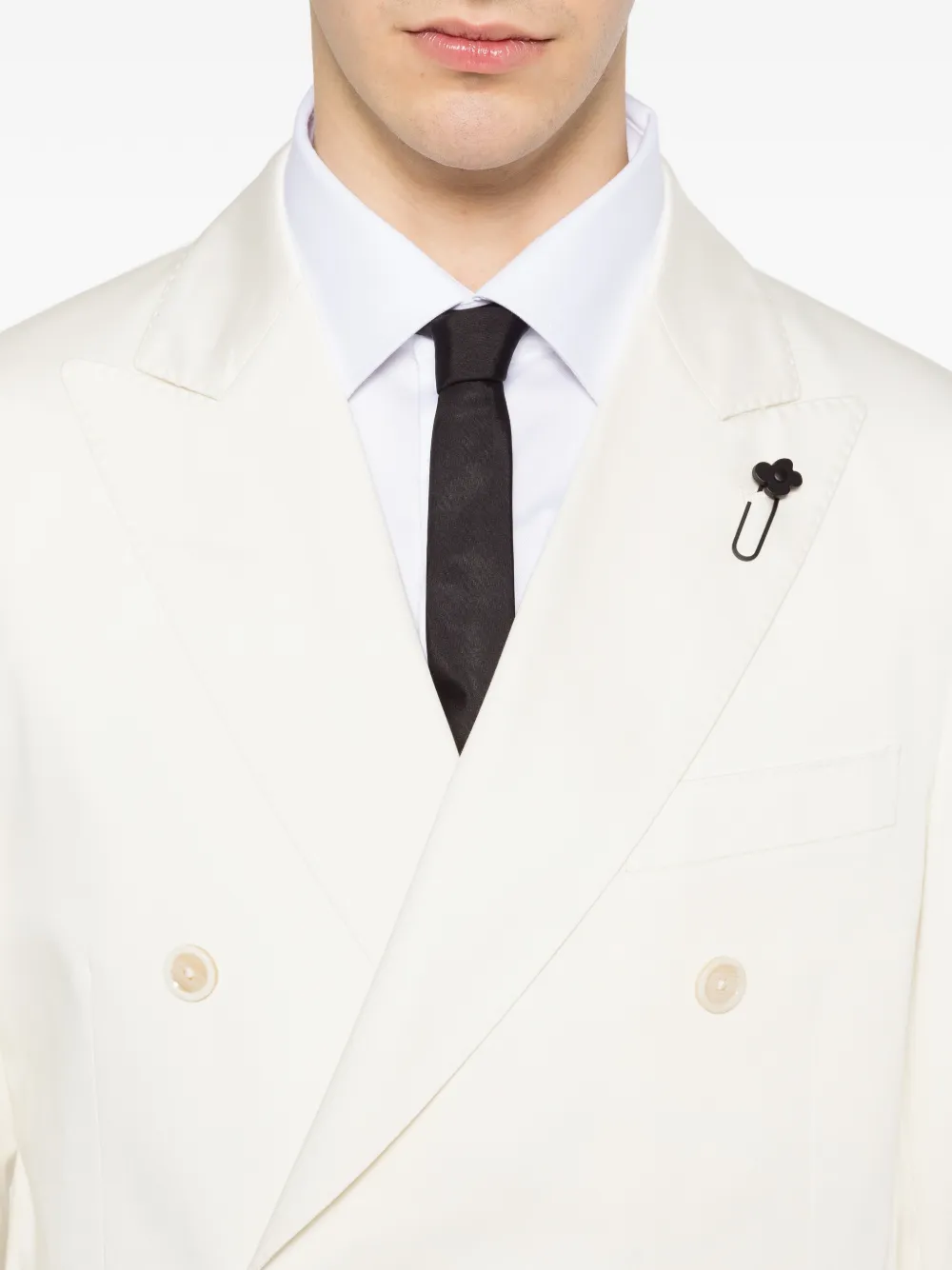 Белый двубортный пиджак с клапанами на карманах и застежкой на пуговицы