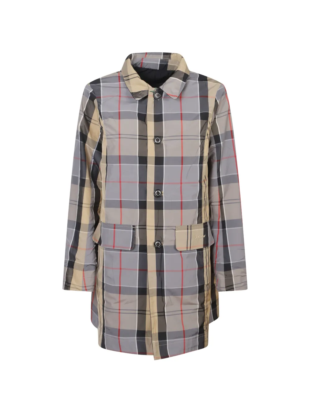 Черная двусторонняя куртка с тартановым принтом, застежкой на пуговицах, длинными рукавами, накладными карманами с клапанами и прямым подолом