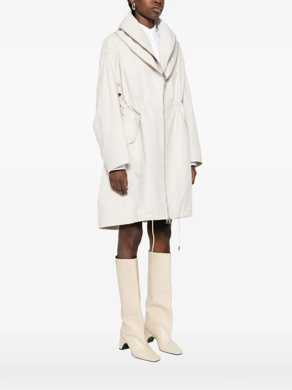 Бежевый капюшон, застежка-молния спереди, фронтальные накладные карманы с клапанами, кулиска по нижнему краю