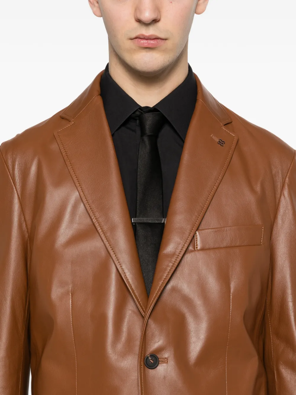 Коричневая кожа, лацканы с вырезом, застежка на пуговицы спереди, нагрудный прорезной карман, два накладных кармана