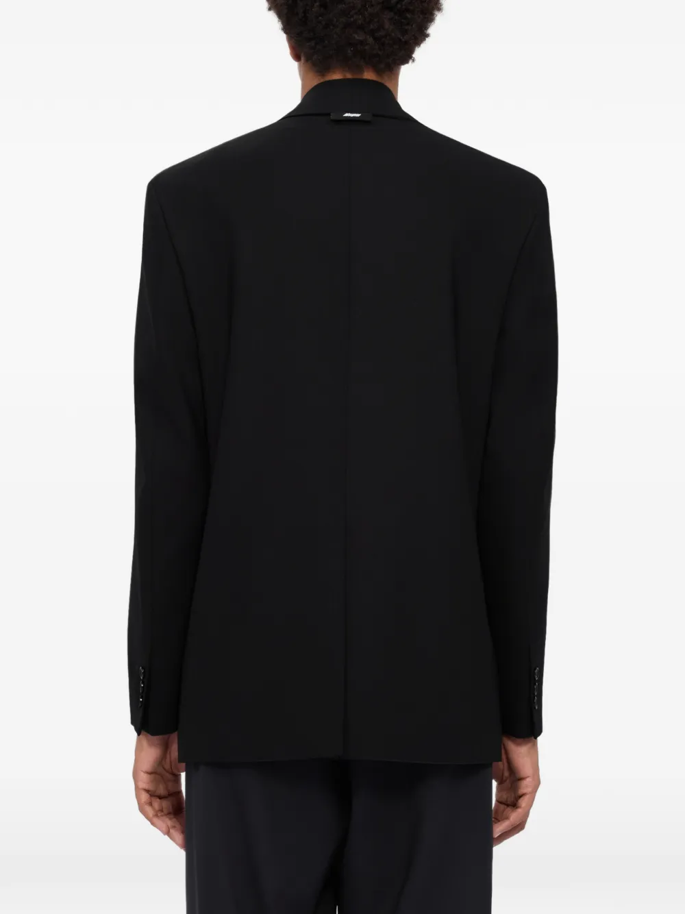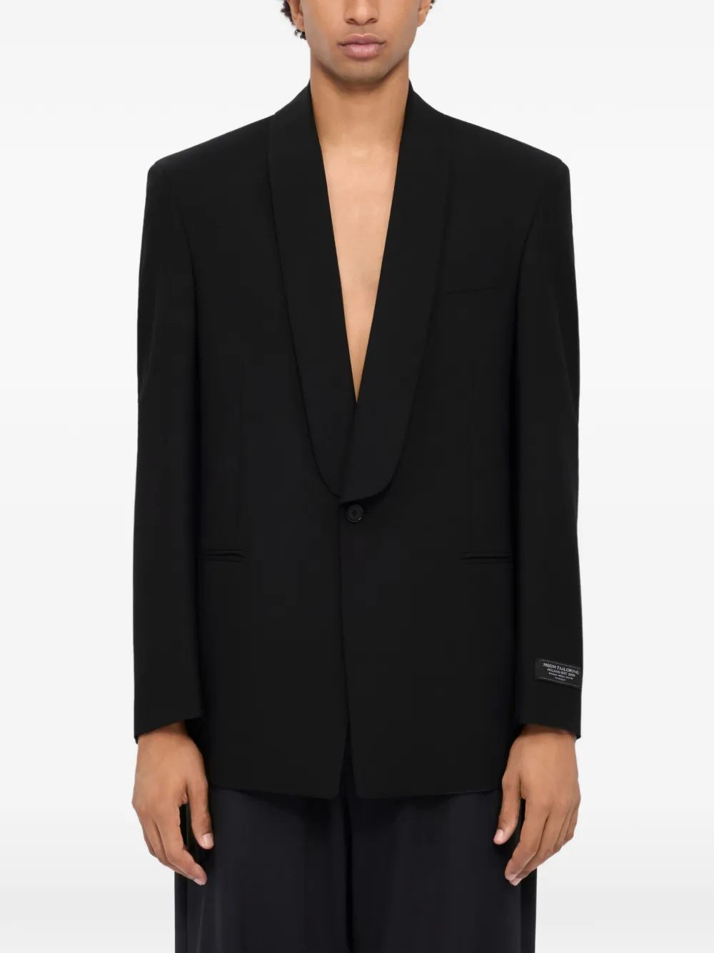 Черный пиджак с шалевым воротником, застежкой на одну пуговицу, отделкой на манжете, тремя пуговицами на манжетах и прорезным карманом