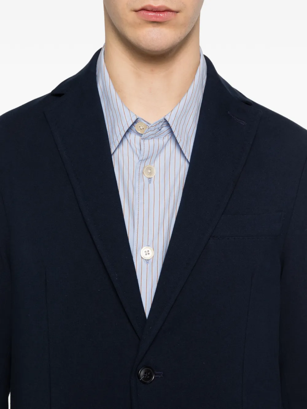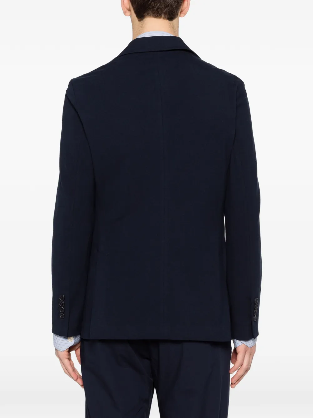 Темно-синий цвет, лацканы с выемкой, застежка на пуговицы спереди, накладные карманы, длинные рукава, манжеты на пуговицах