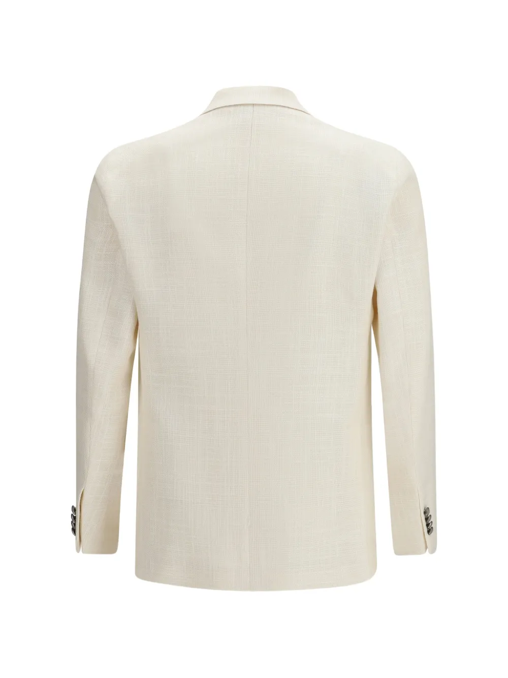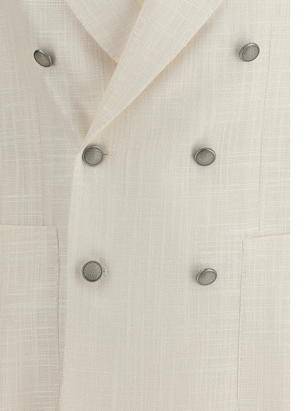 Кремово-белый двубортный пиджак с застежкой на пуговицы, заостренными лацканами, накладными карманами и длинными рукавами