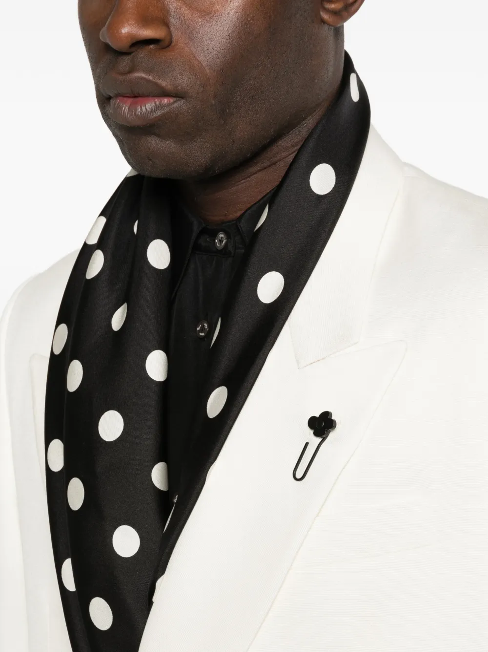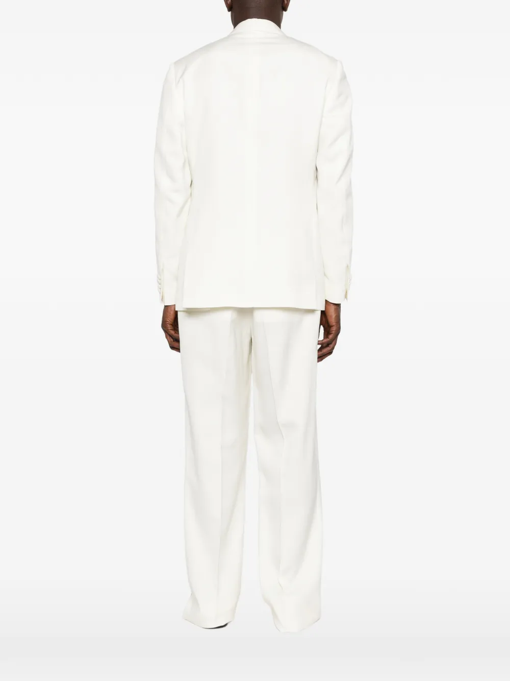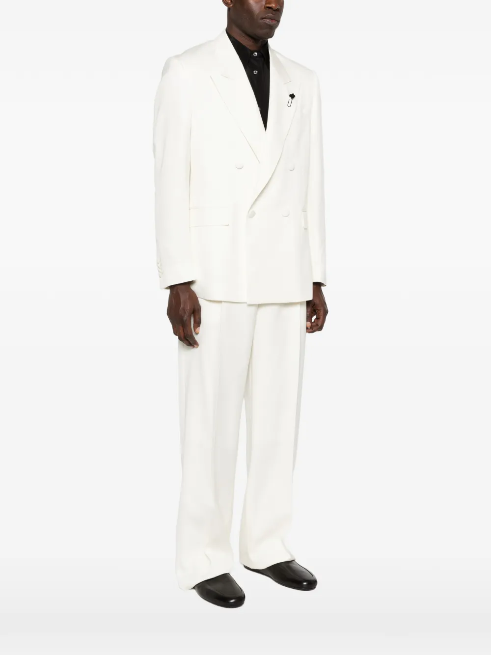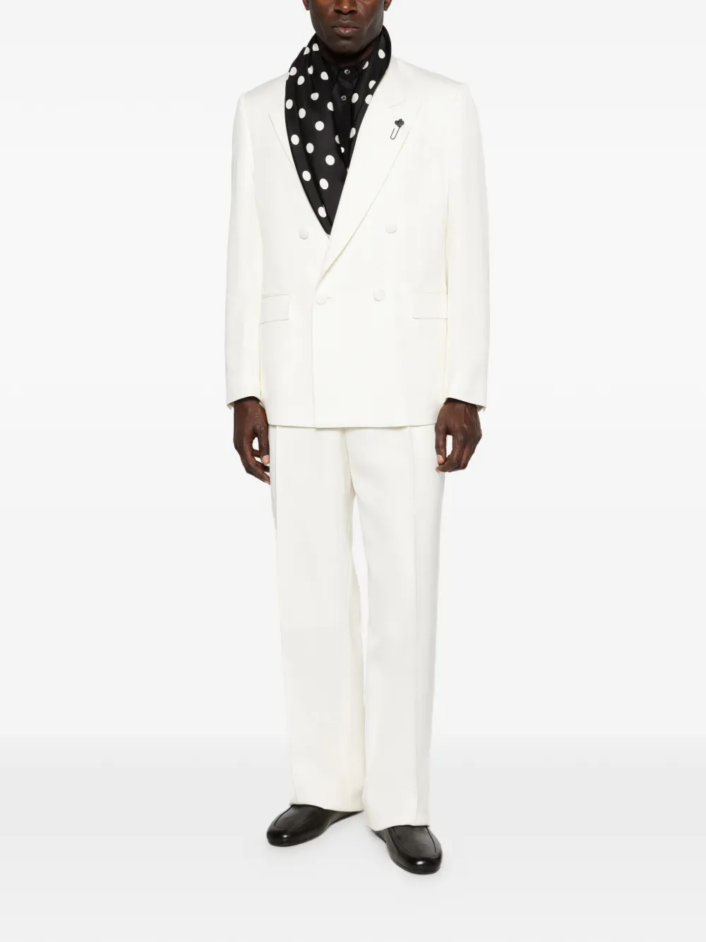 Белый пиджак с заостренными лацканами, клапанами на карманах и двубортной застежкой на пуговицы