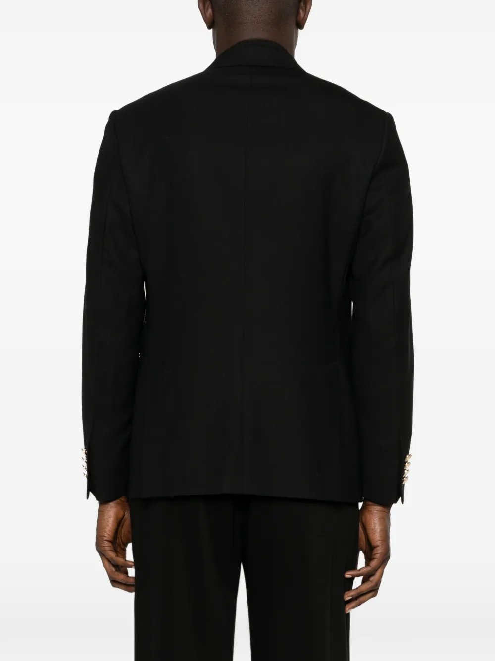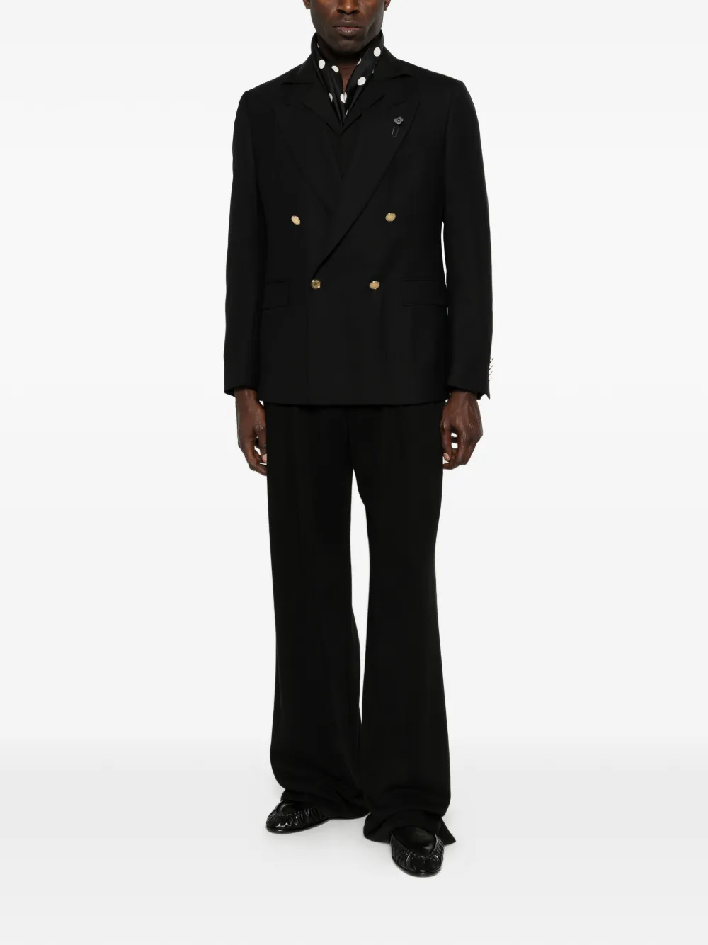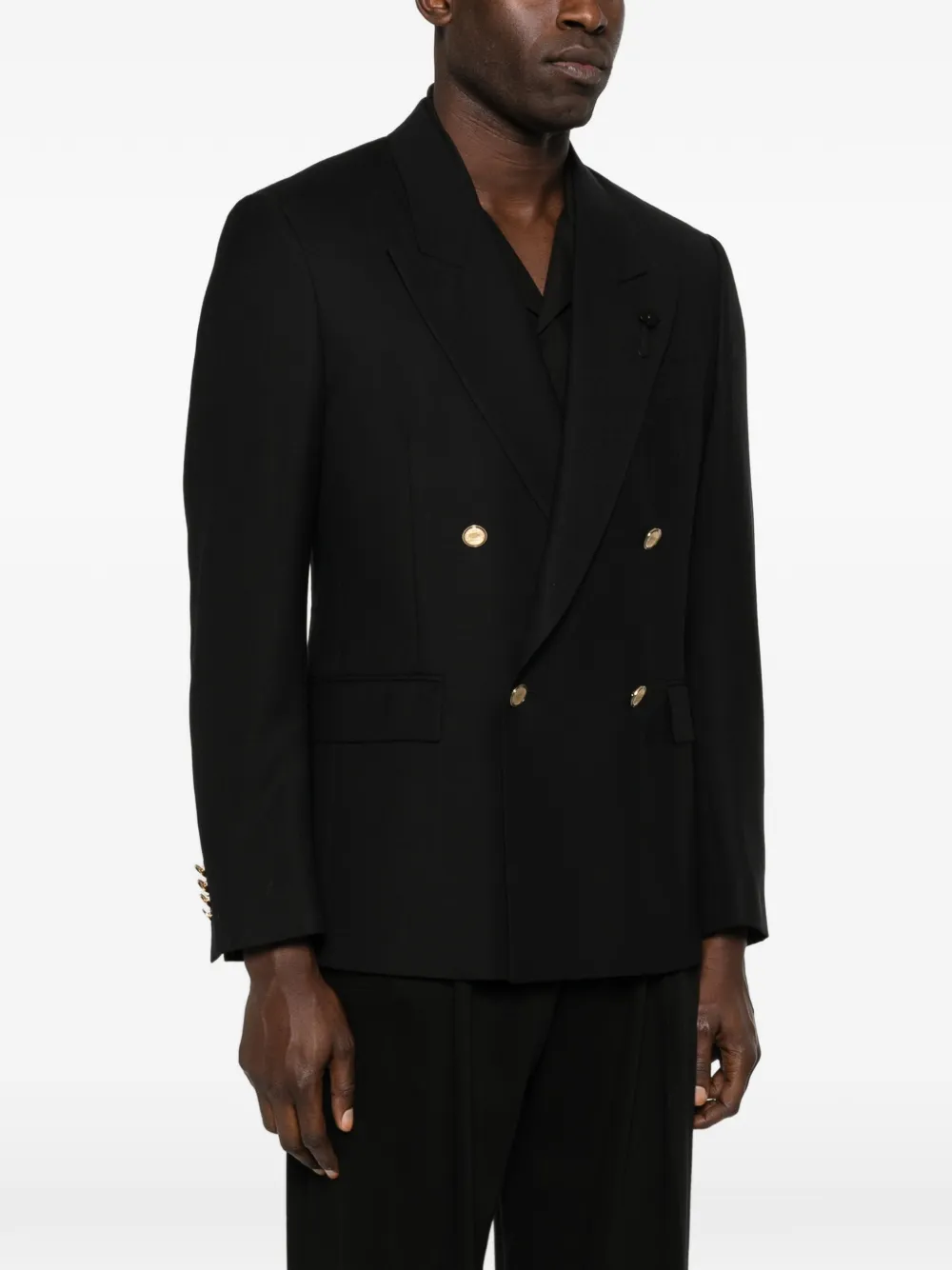 Черный, золотистые пуговицы, двубортный, заостренные лацканы, клапанные карманы
