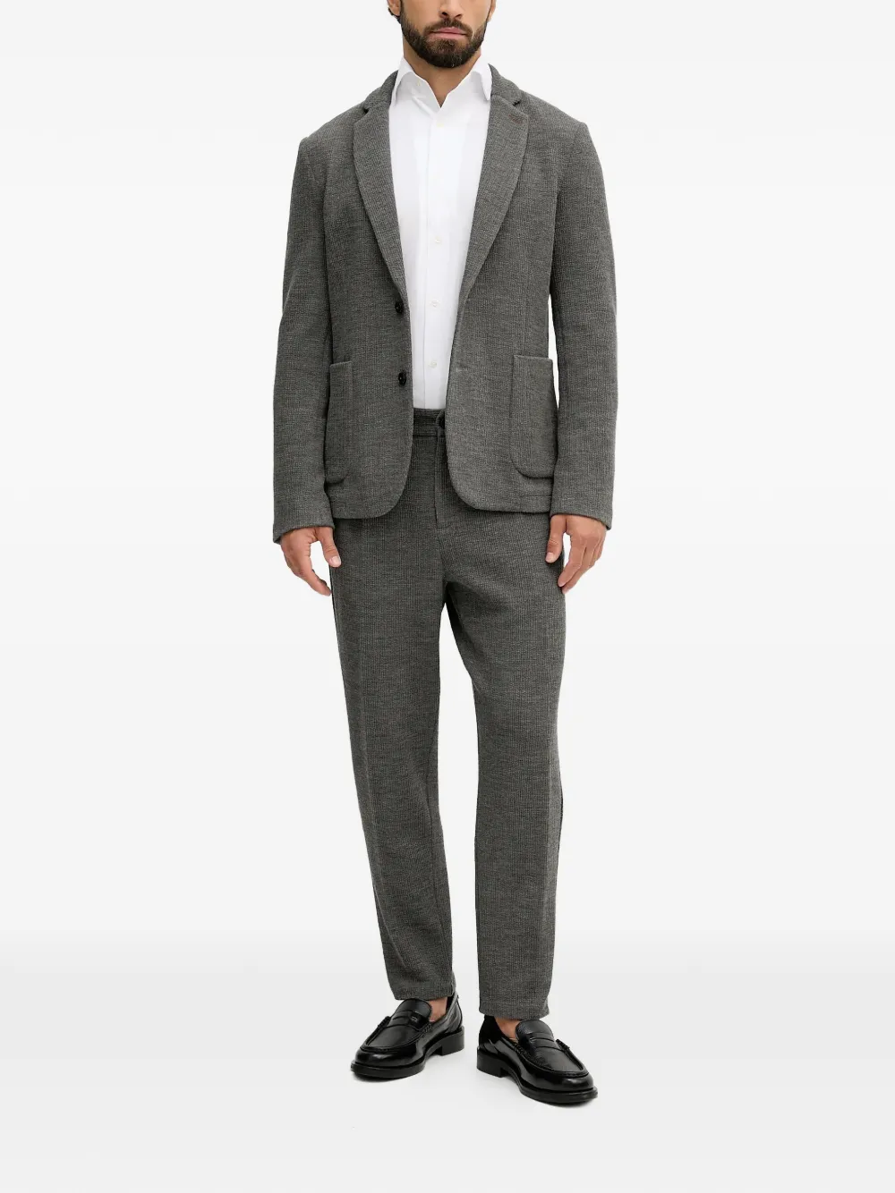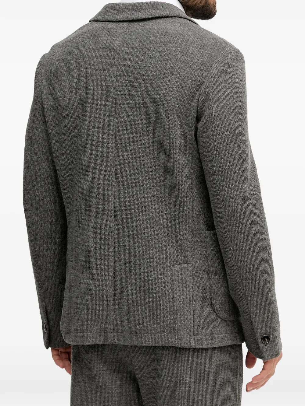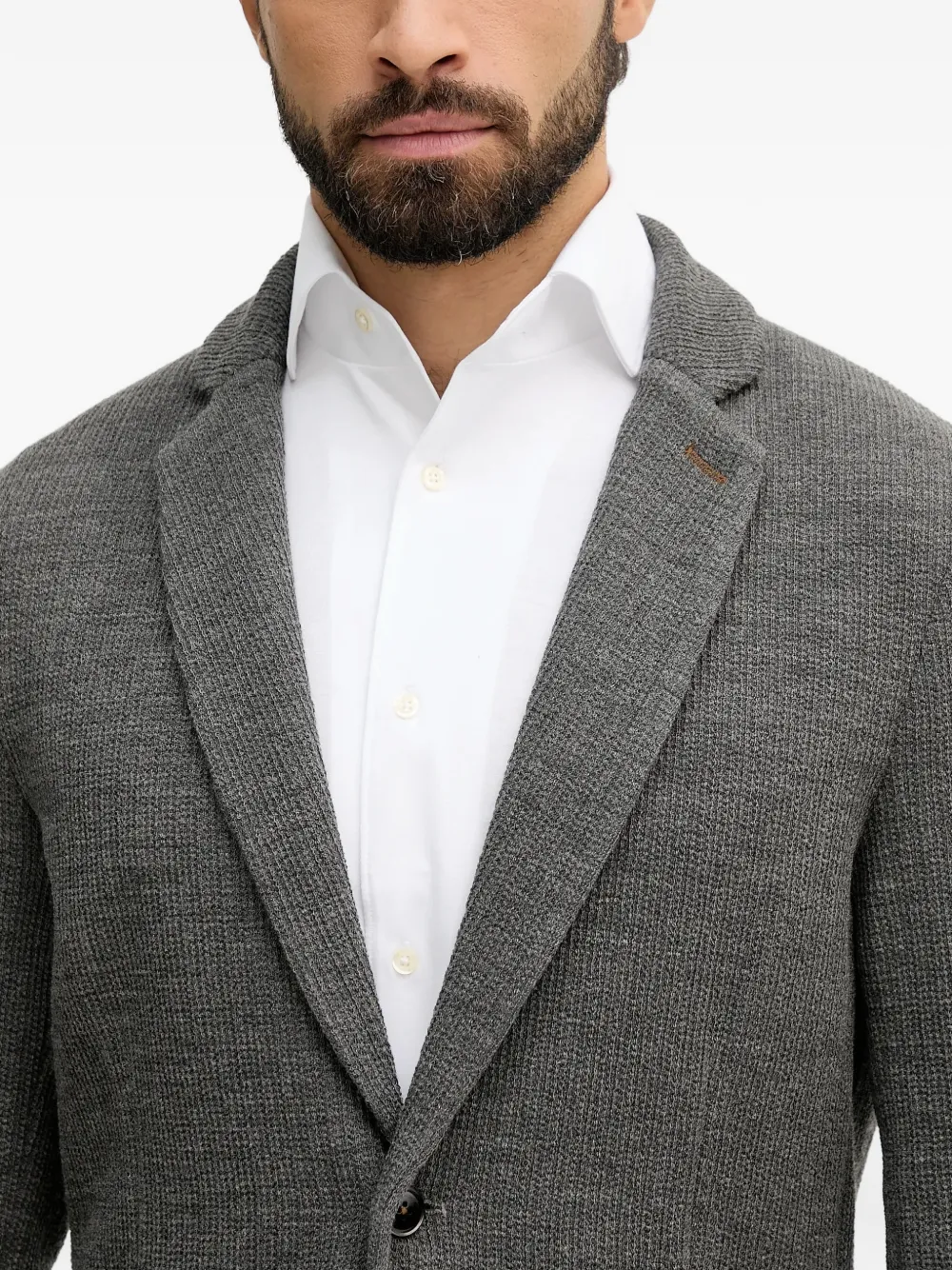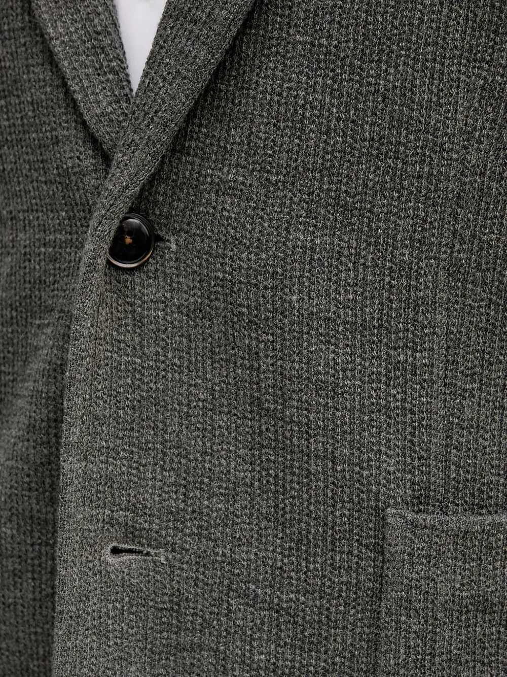 Серые заостренные лацканы, накладной карман спереди, застежка на пуговицы