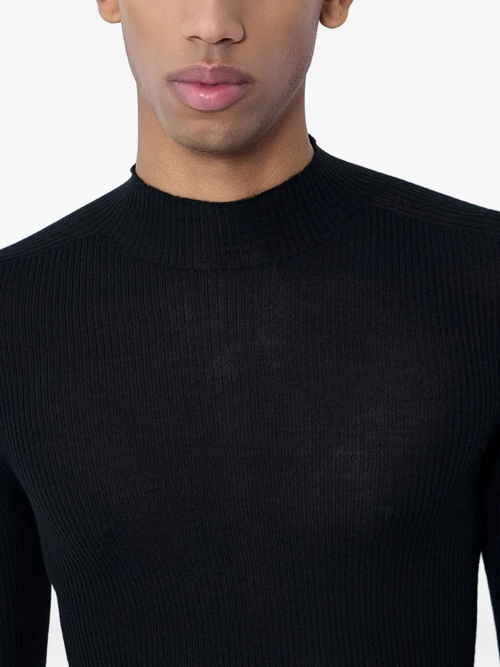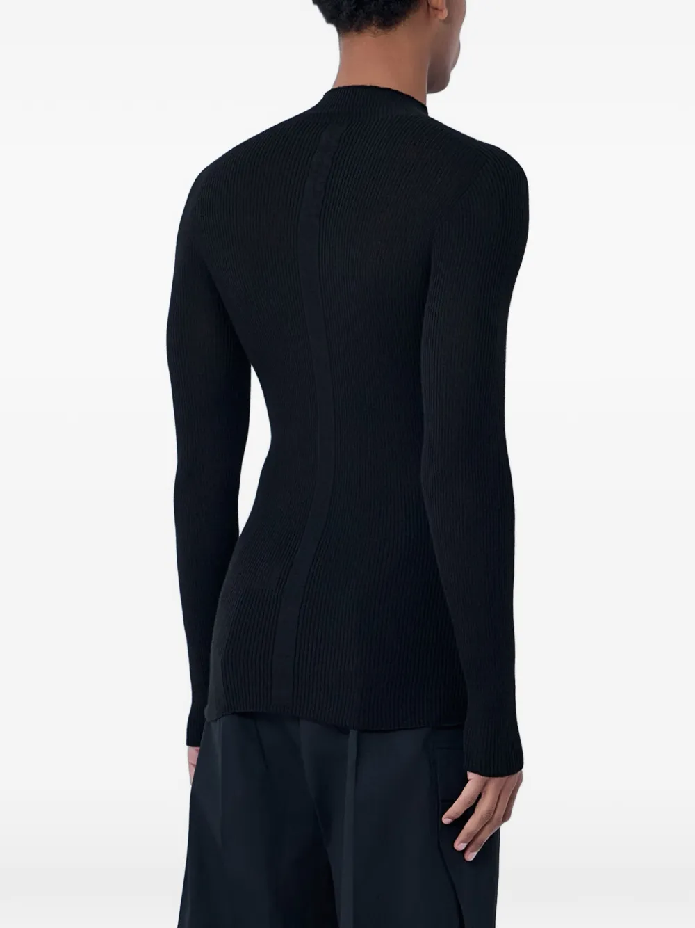 Черный вязаный топ в рубчик с высоким воротом и длинными рукавами