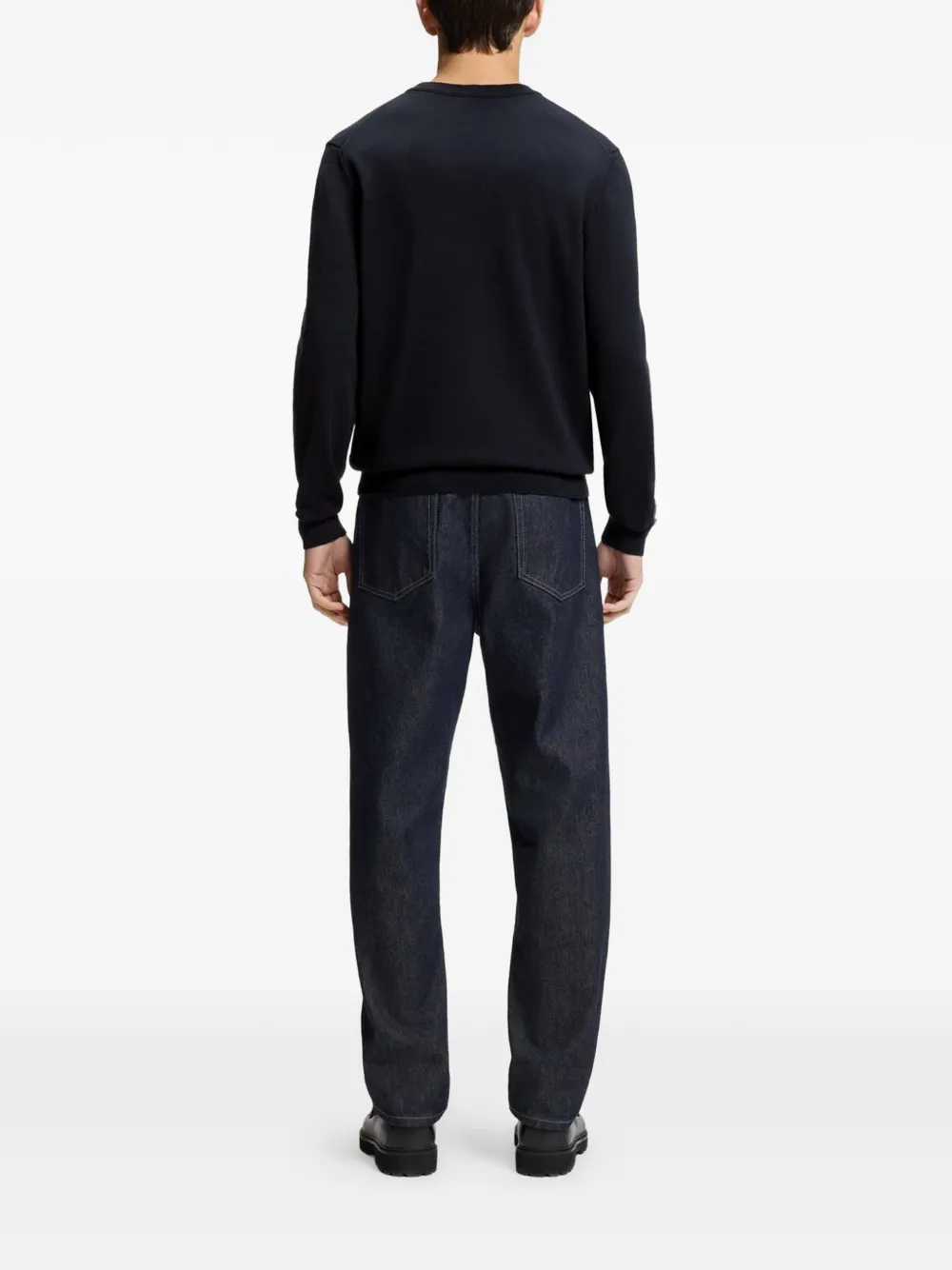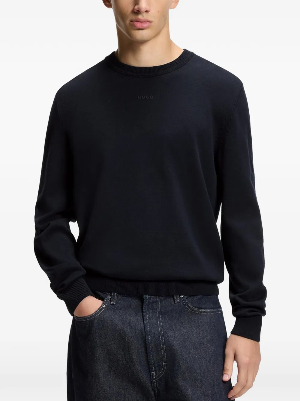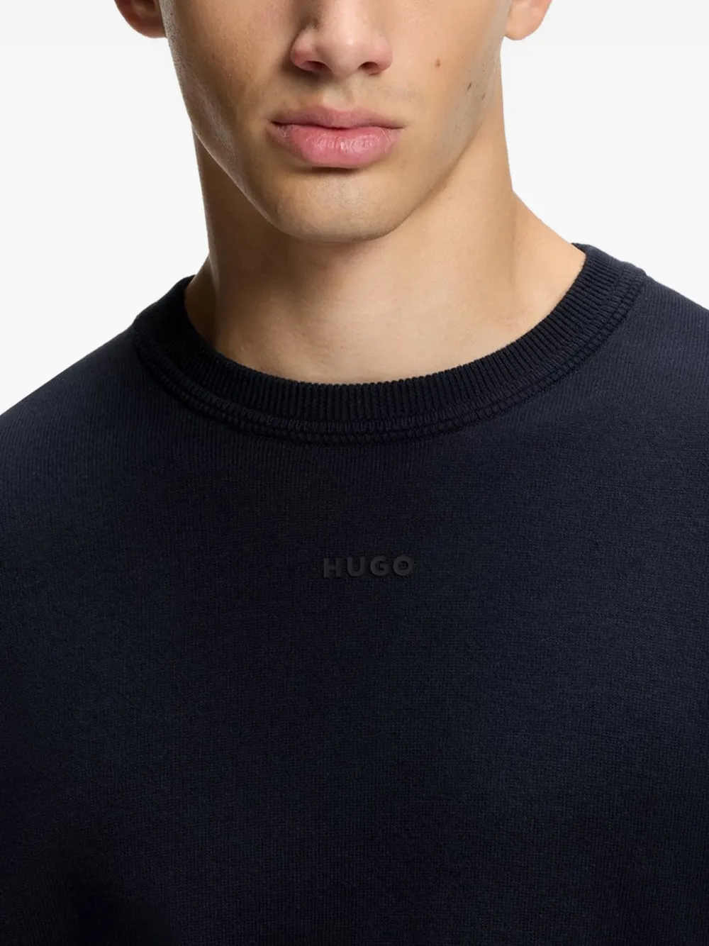 Темно-синий джемпер с круглым вырезом, тональным логотипом, длинными рукавами, ребристыми манжетами и подолом