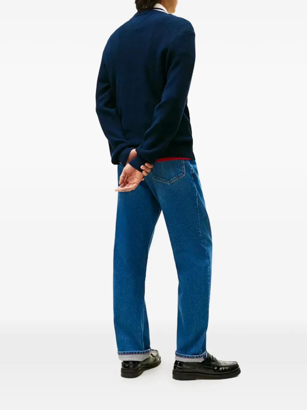 Темно-синий вязаный джемпер с вышитым логотипом, круглым вырезом, длинными рукавами и ребристыми манжетами