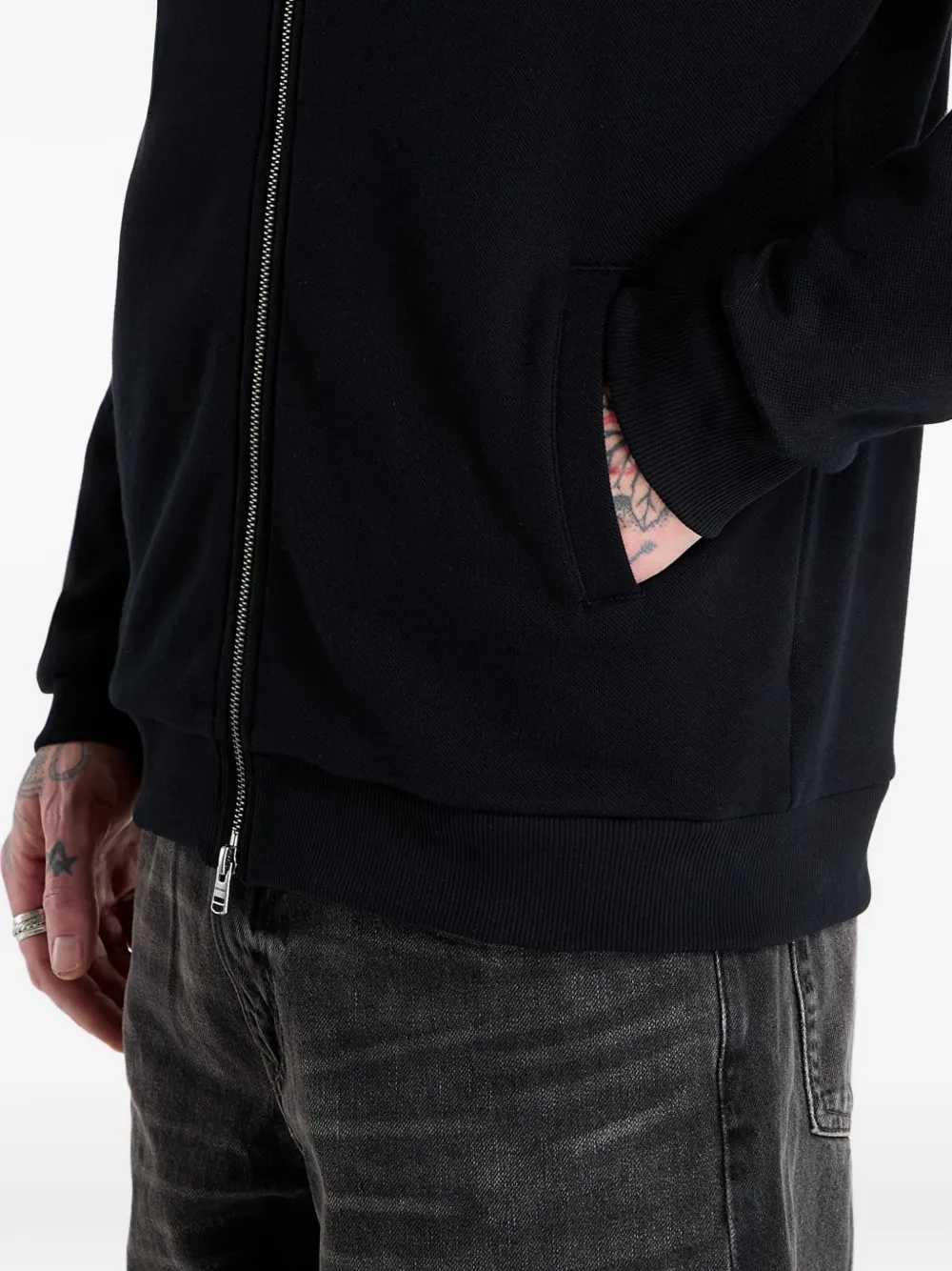 Черная куртка на молнии с воротником, длинными рукавами, передними карманами и вышивкой-логотипом