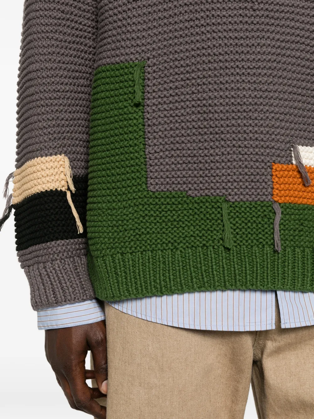 Серый вязаный свитер с дизайном в стиле пэчворк, круглым вырезом, длинными рукавами и бахромой