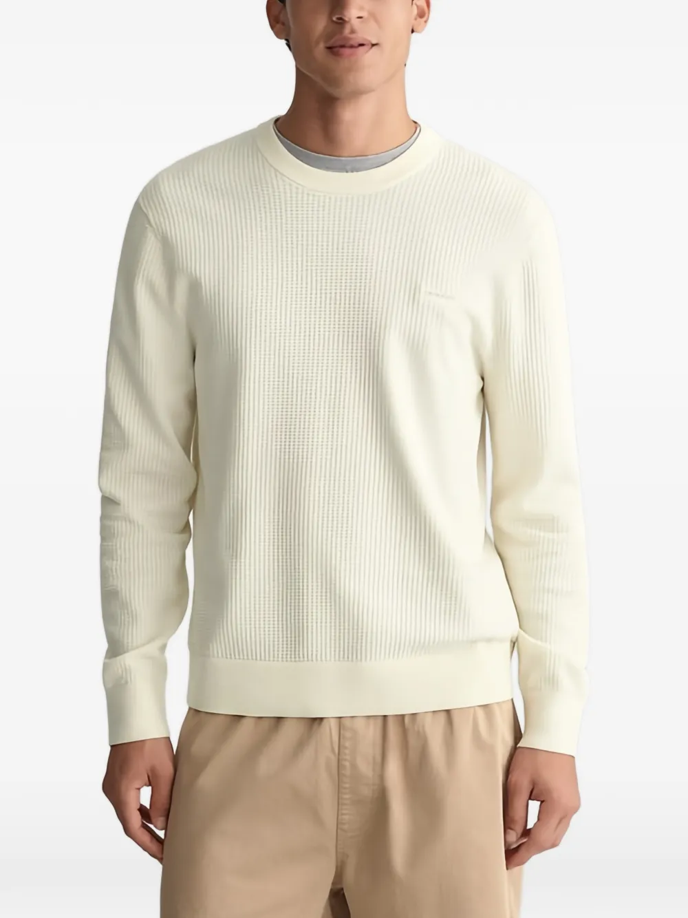 Бежевый джемпер вафельной вязки с круглым вырезом, длинными рукавами и вышитым логотипом
