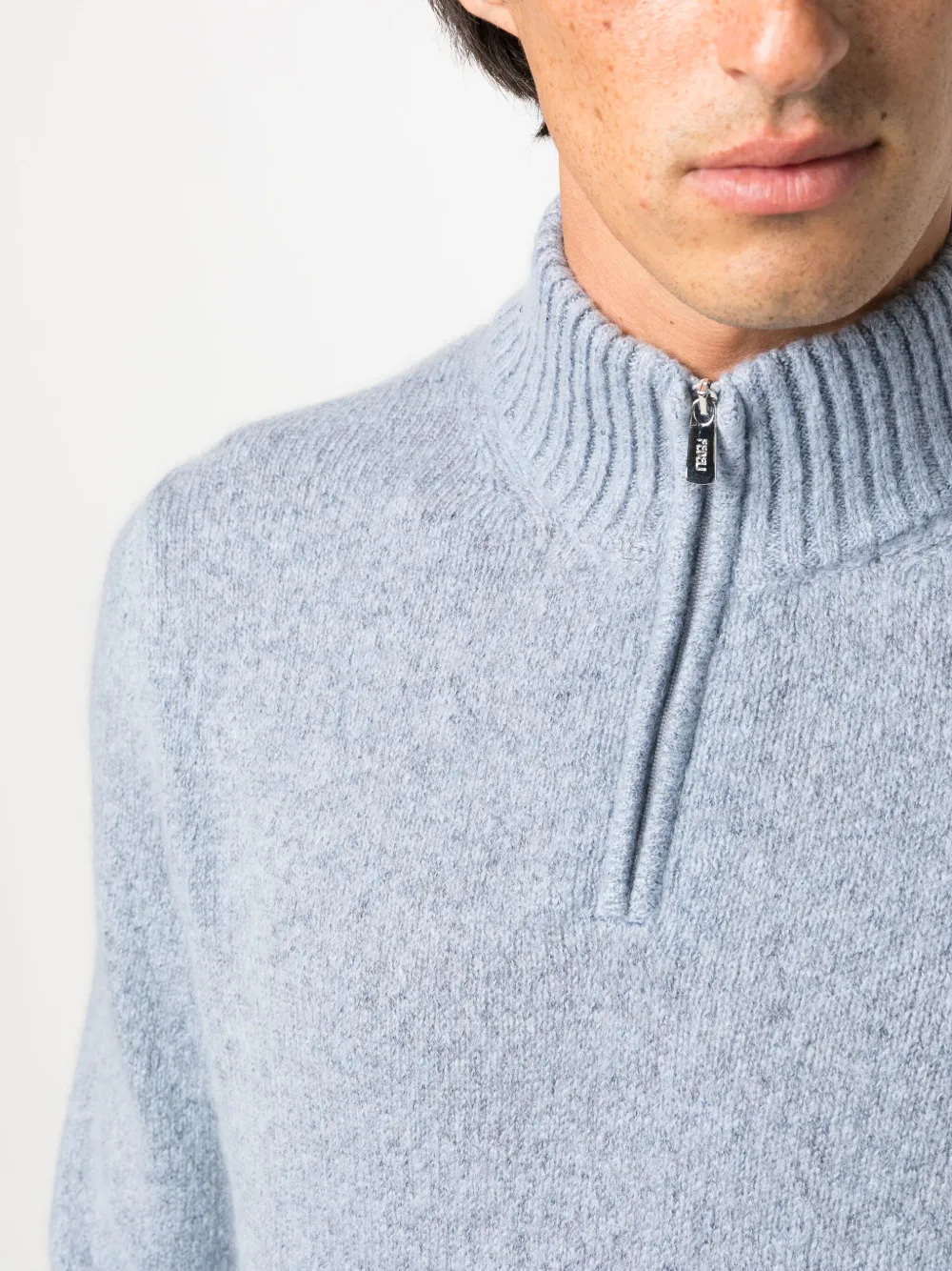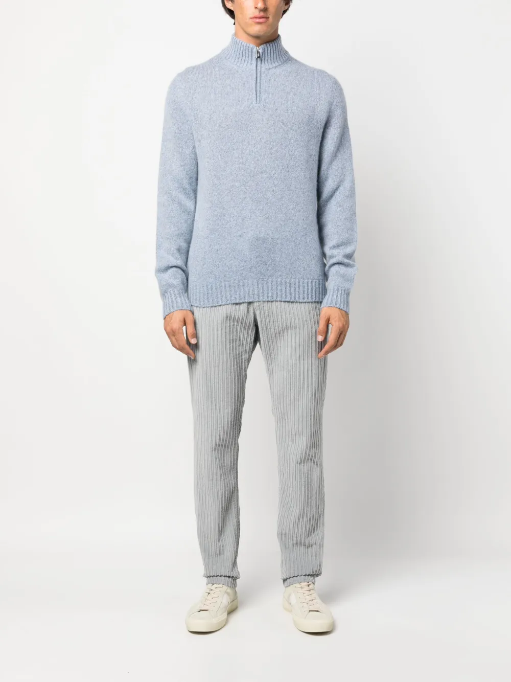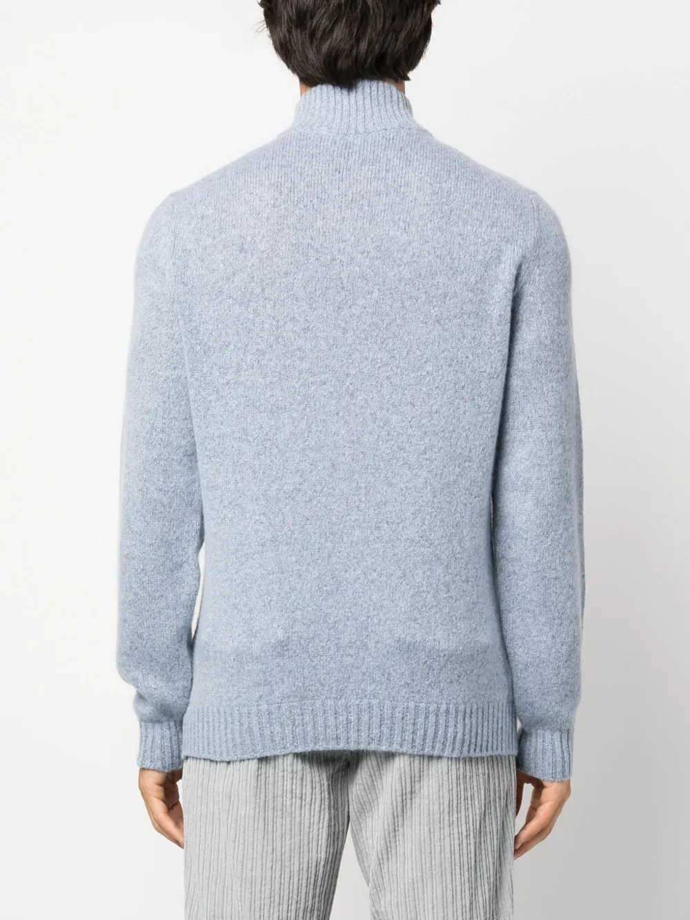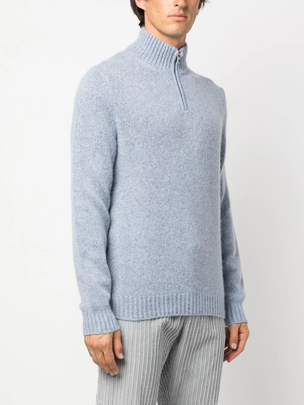 Голубой, смесь шерсти и кашемира, тонкая вязка, воротник-стойка, короткая застежка на молнии спереди и длинные рукава.