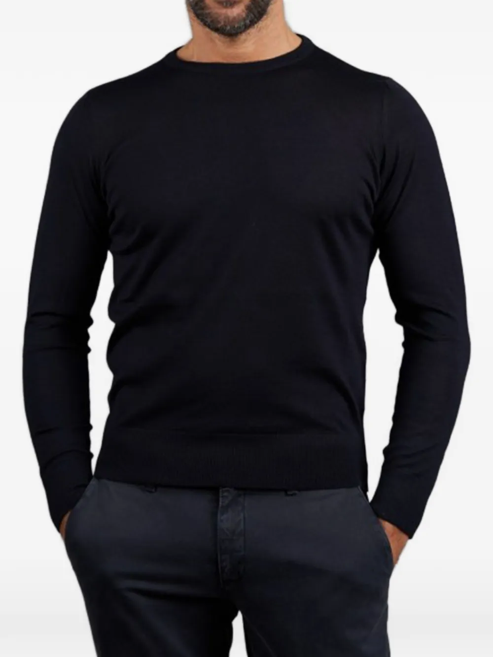 Темно-синий шерстяной джемпер с круглым вырезом, длинными рукавами, ребристыми манжетами и поясом