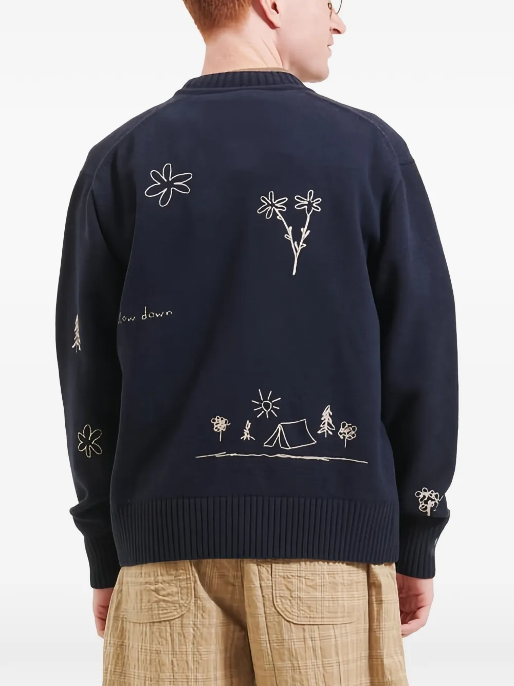 Синий джемпер с вышивкой, застежкой на пуговицах, круглым вырезом, длинными рукавами и ребристыми краями