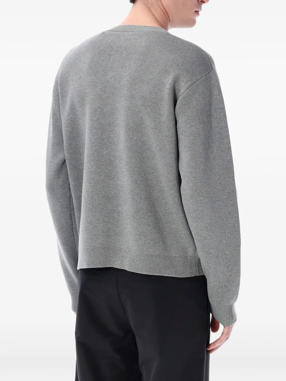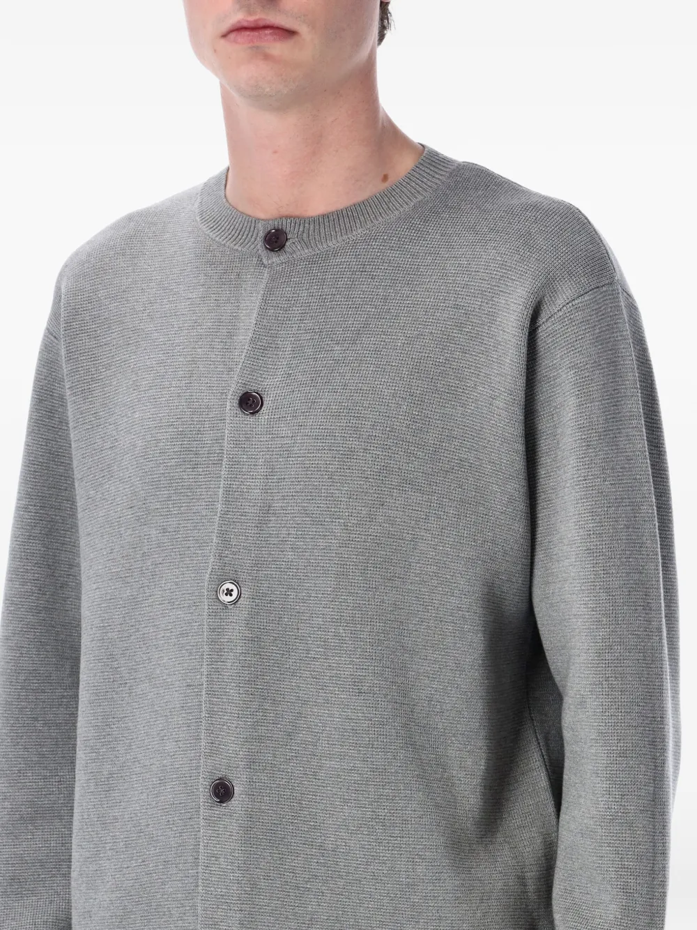Серый цвет, застежка на пуговицы спереди, ребристые манжеты и низ, круглый вырез, длинные рукава