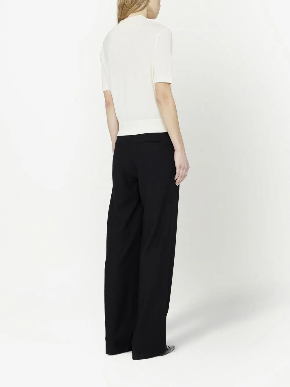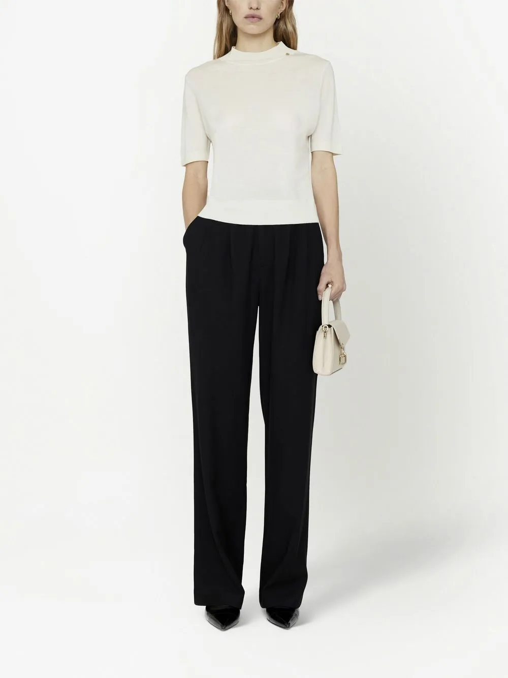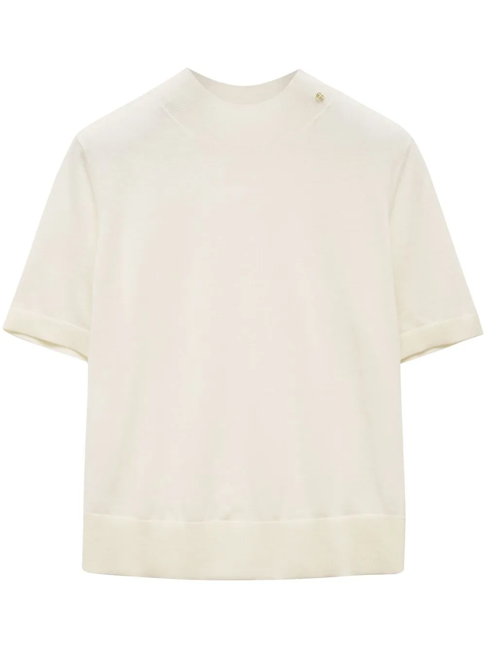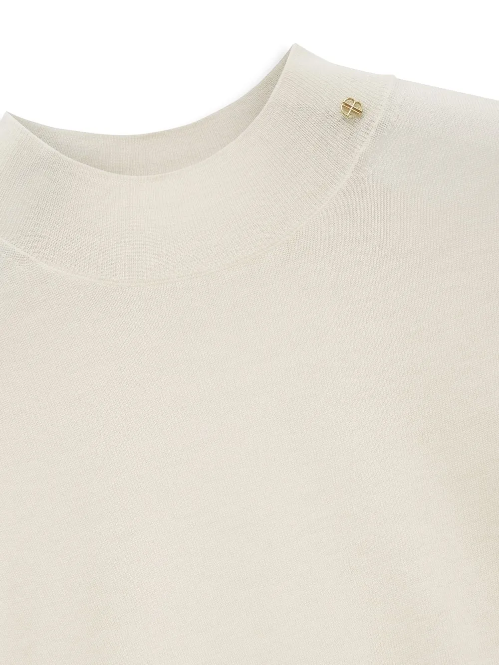 Цвет слоновой кости, шерсть мериноса, кашемир, трикотажный материал, высокий воротник, короткие рукава и прямой подол.