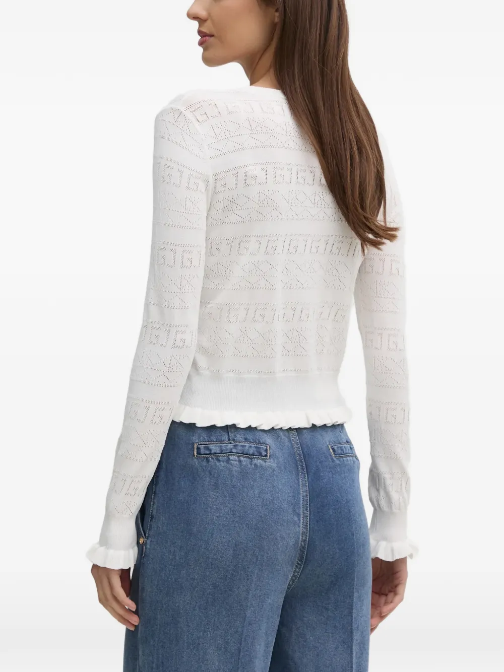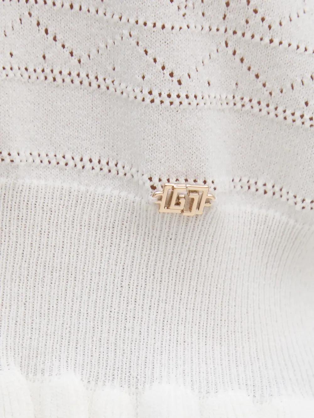 Белый цвет, геометрический узор, длинные рукава, круглый вырез, волнистый край, деталировка с логотипом