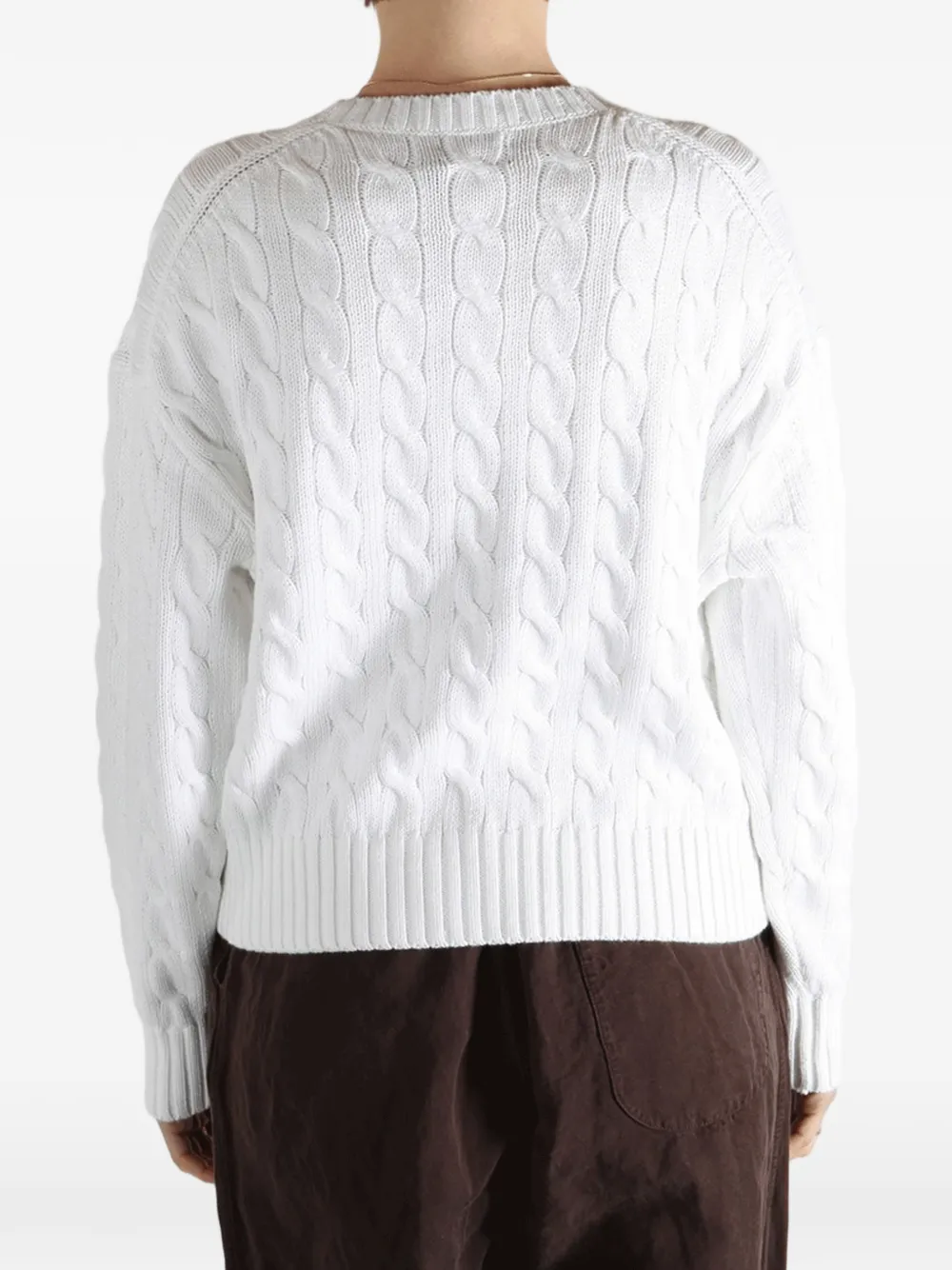 Белый джемпер с косами, круглый вырез, ребристый низ, длинные рукава, вышивка с логотипом