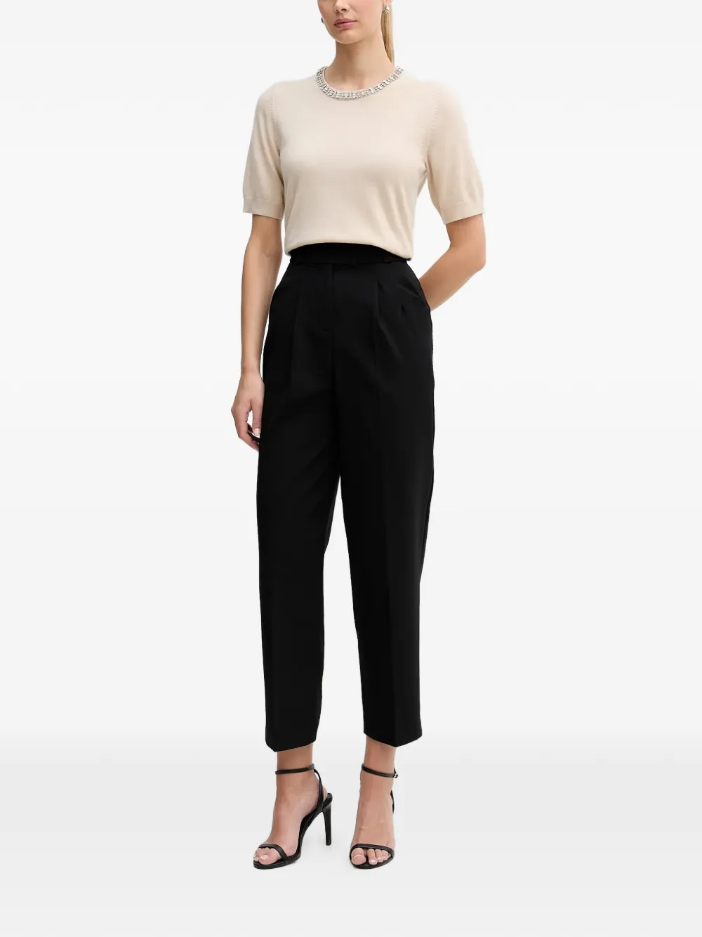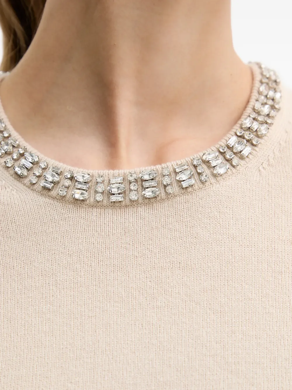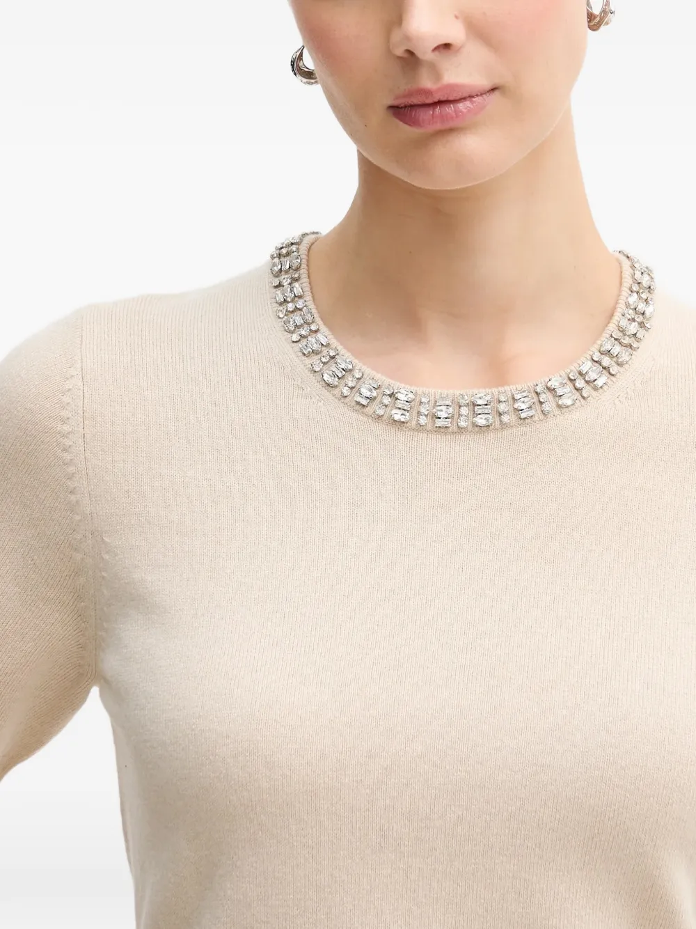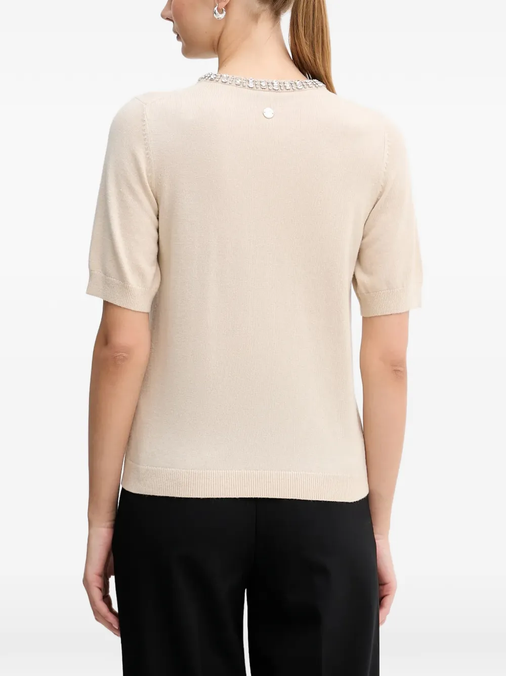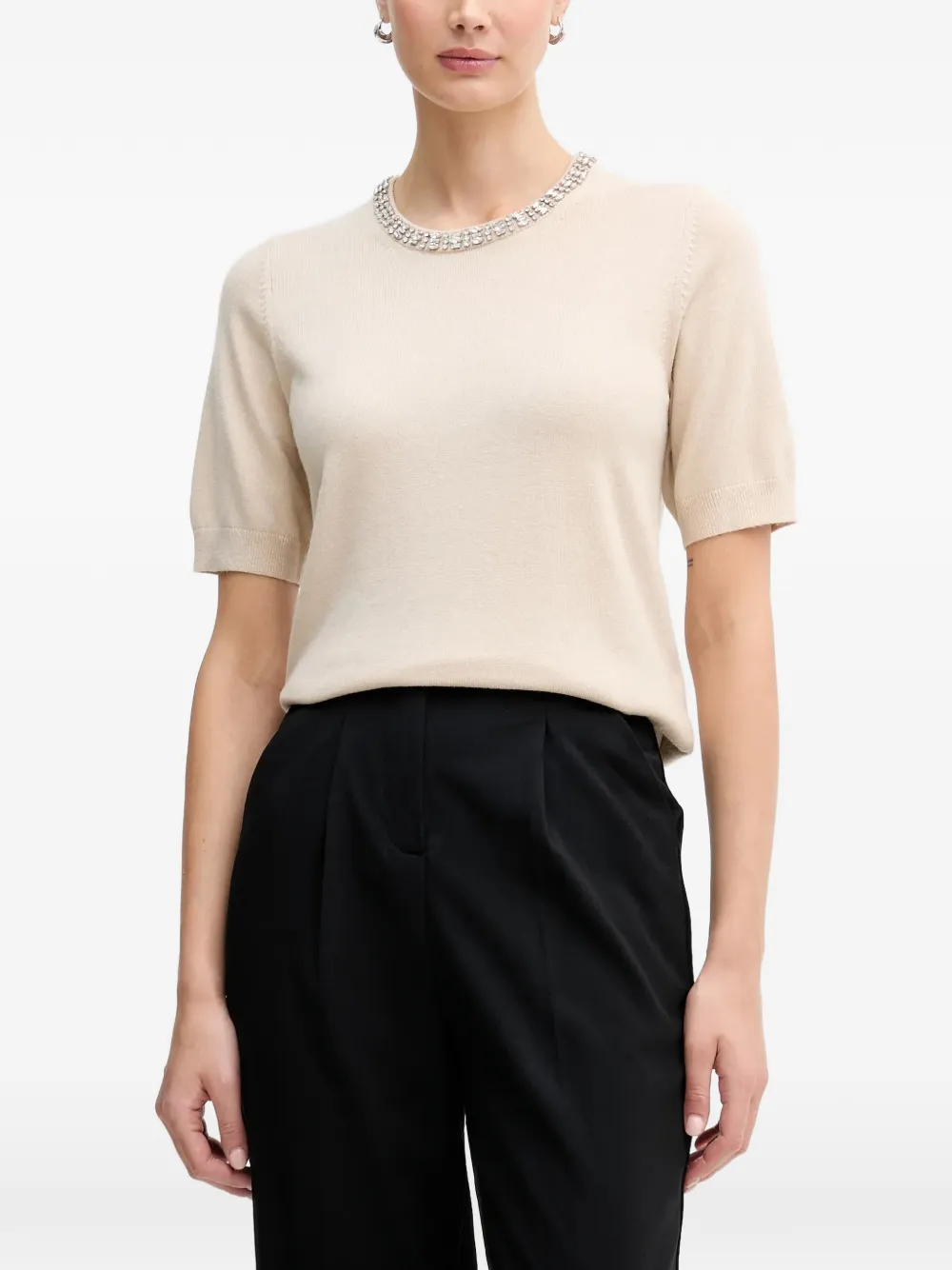Бежевая футболка с украшенным вырезом, короткими рукавами и круглым воротом