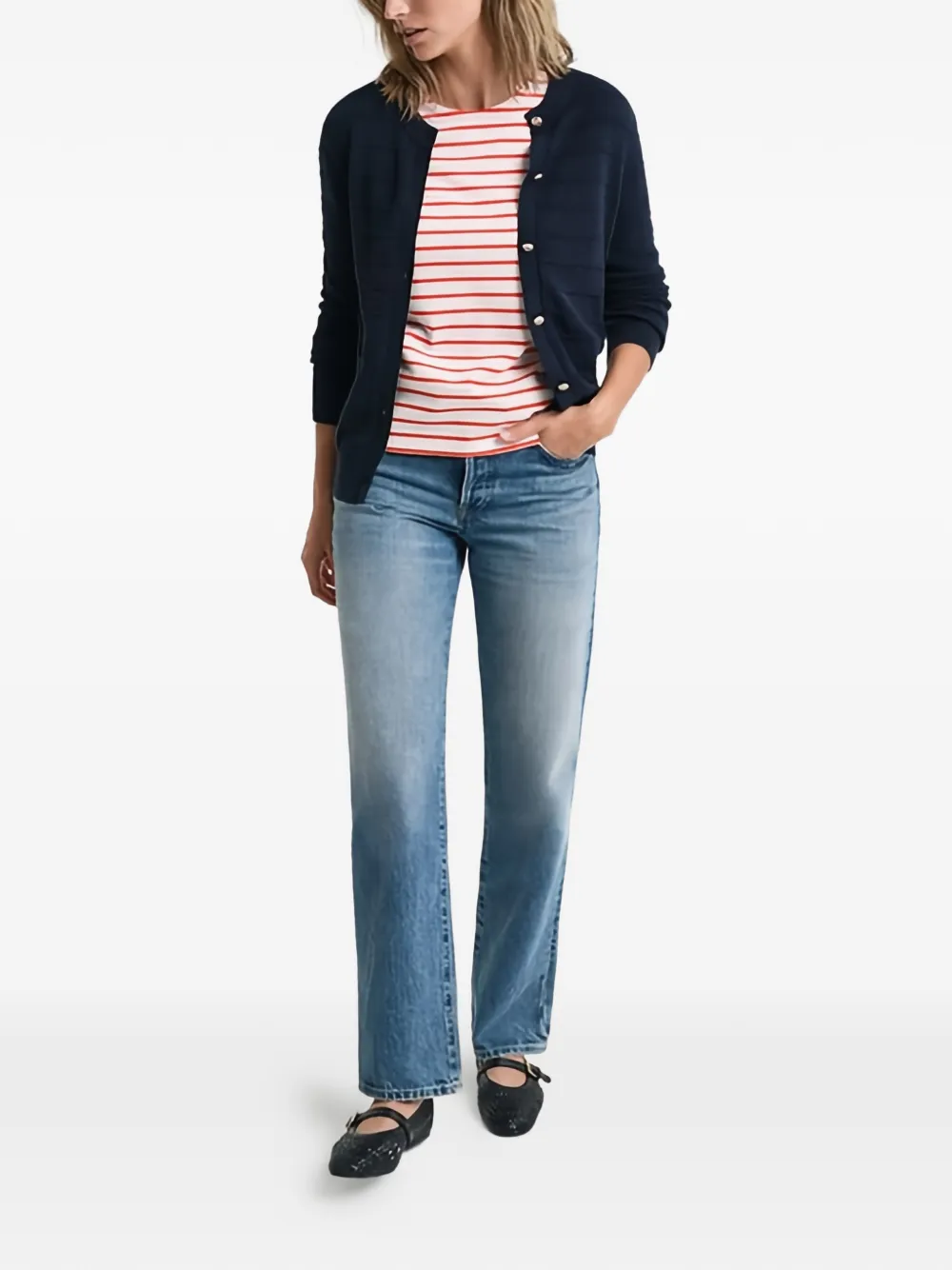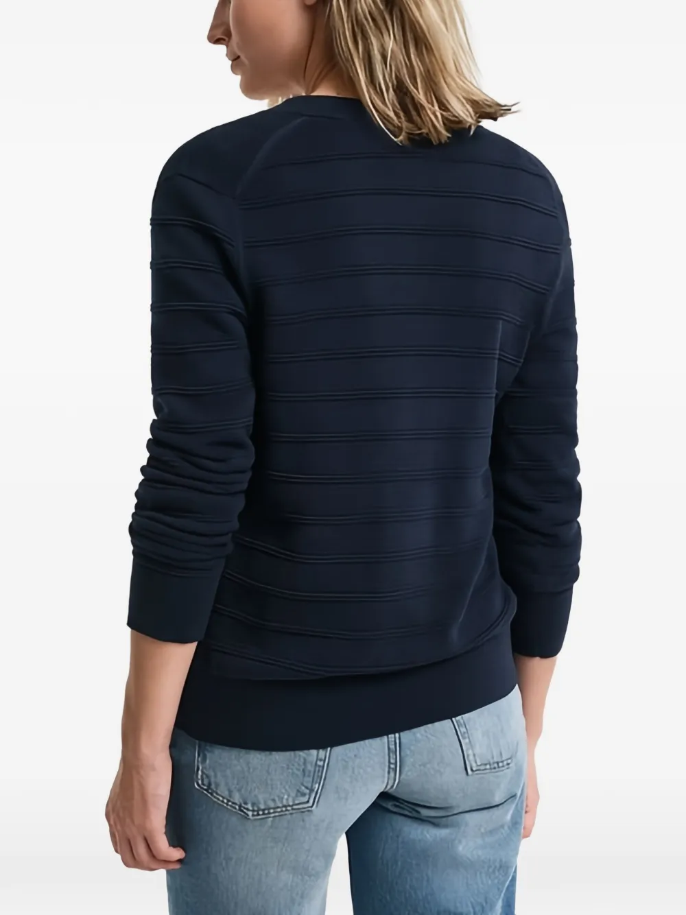 Синий, золотистые пуговицы, текстурированная вязаная ткань, круглый вырез, длинные рукава, ребристые края